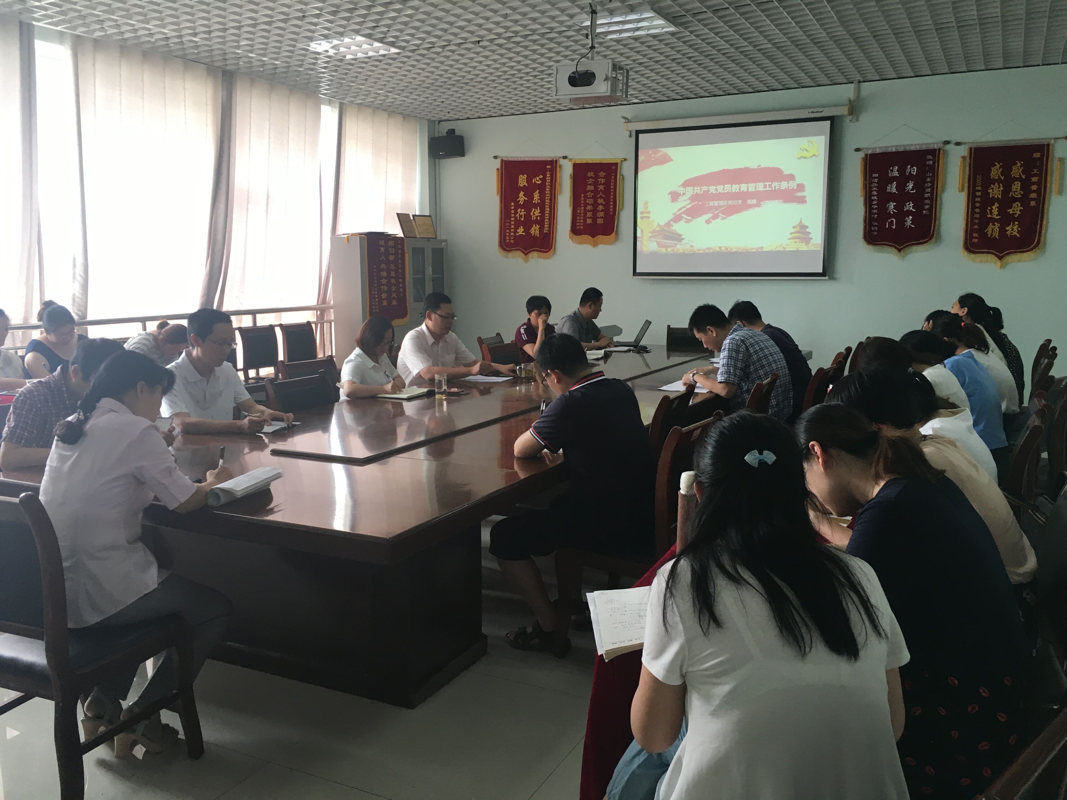 6月18日下午,工商管理系党总支书记高巍讲党课,带领大家在实训楼508会议室学习了《中国共产党党员教育管理工作条例》,全体教师党员参加了学习。