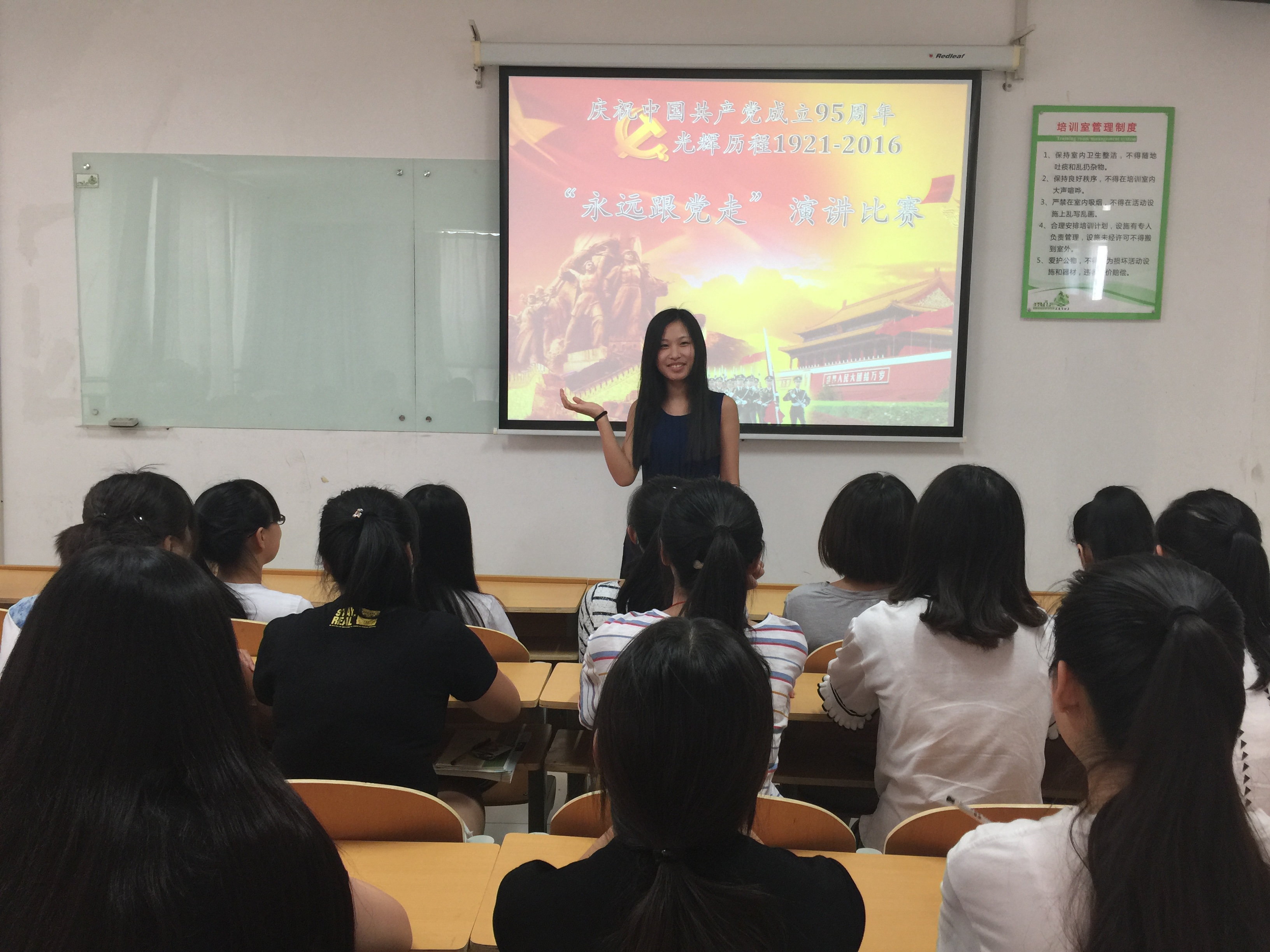 为庆祝中国共产党建党95周年,回顾党的奋斗历史,讴歌党的光辉业绩,弘扬党的优良传统,培育和践行社会主义核心价值观,激发大学生爱党爱国热情,近日,工商管理系开展了唱红色歌曲、看红色电影、“永远跟党走”演讲比赛等系列主题活动,为党的95岁生日献礼。