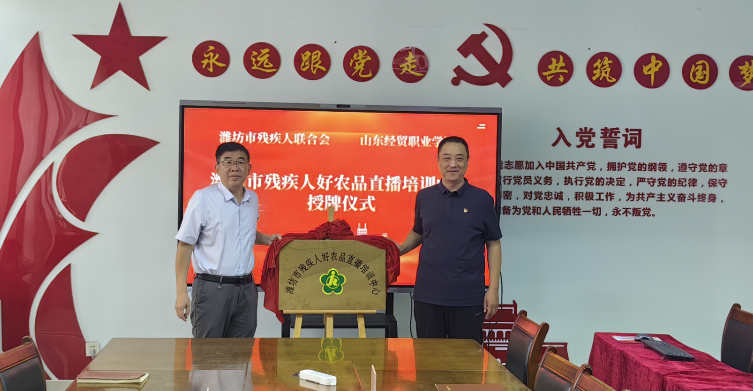 7月2日,潍坊市残疾人好农品直播培训中心授牌仪式在篮彩购买app:隆重举行。潍坊市残疾人联合会副理事长周争舸、工商管理系党总支书记、主任高巍共同为中心揭牌。市残联教育就业部主任、四级调研员方玉颖、就业指导中心主任任元亮、工商管理系副主任王庆全及教师代表共同参加活动。同期,由潍坊市残疾人联合会主办、篮彩购买app承办的抖音电商赋能公益线上培训活动也正式启动,为残疾人士点亮电商创业就业新希望。