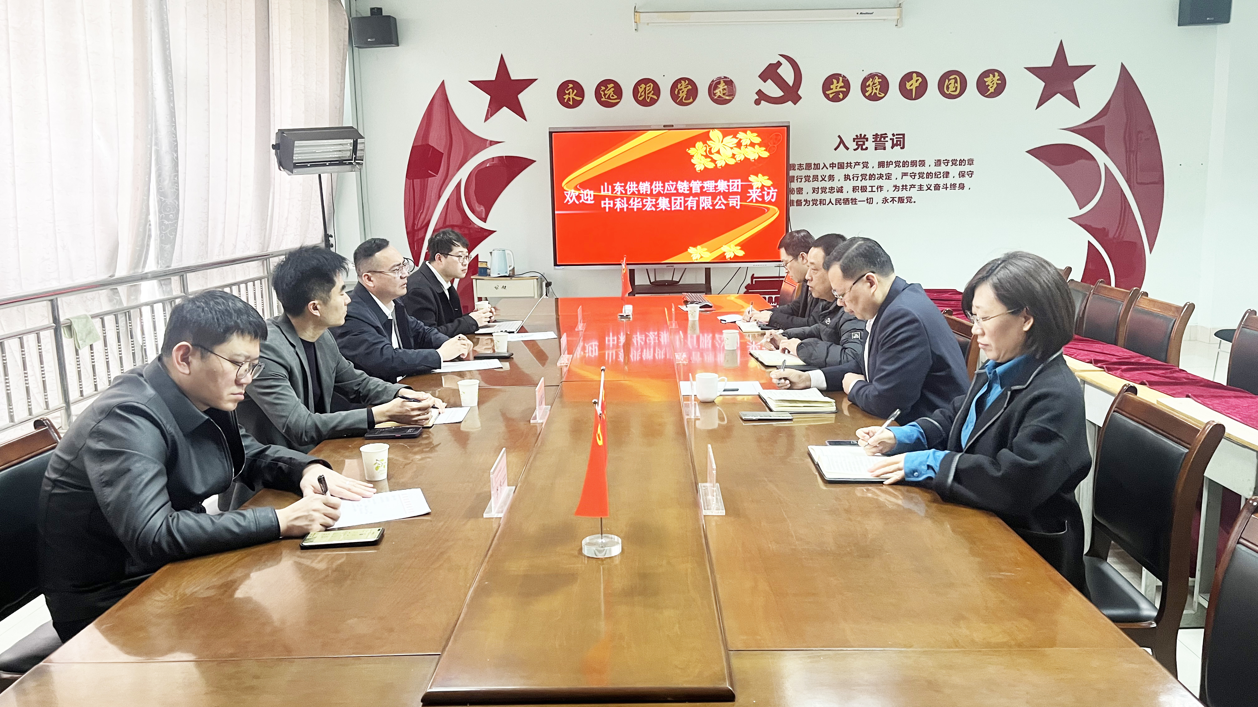 来访的山东供销供应链管理集团常务副总经理张强伟、业务经理陈相宇,中科华宏集团有限公司总裁庄雷、CTO李东,与工商管理系党总支书记高巍、副主任高义丰和电子商务、网络营销与直播电商专业负责人进行了座谈。