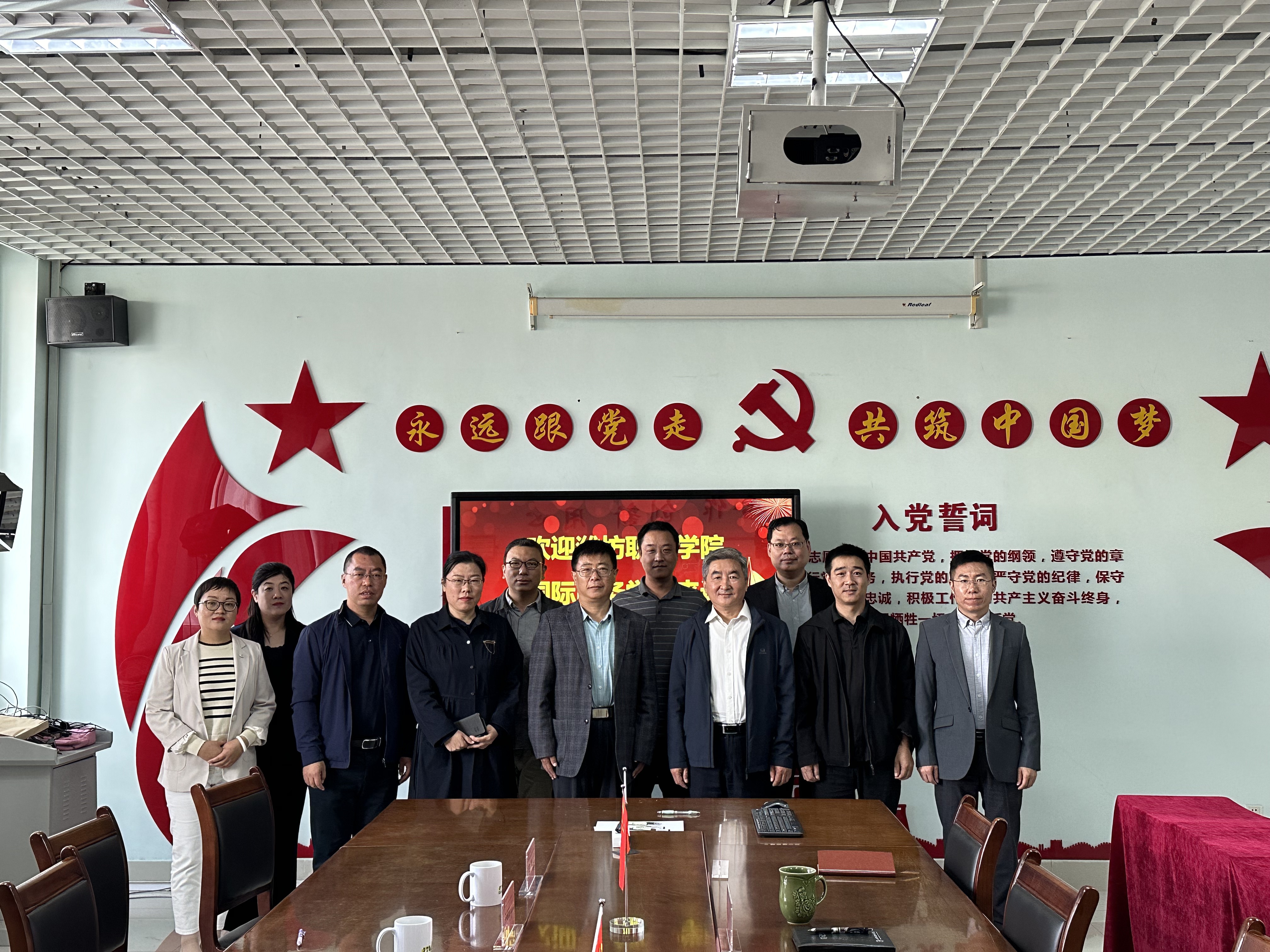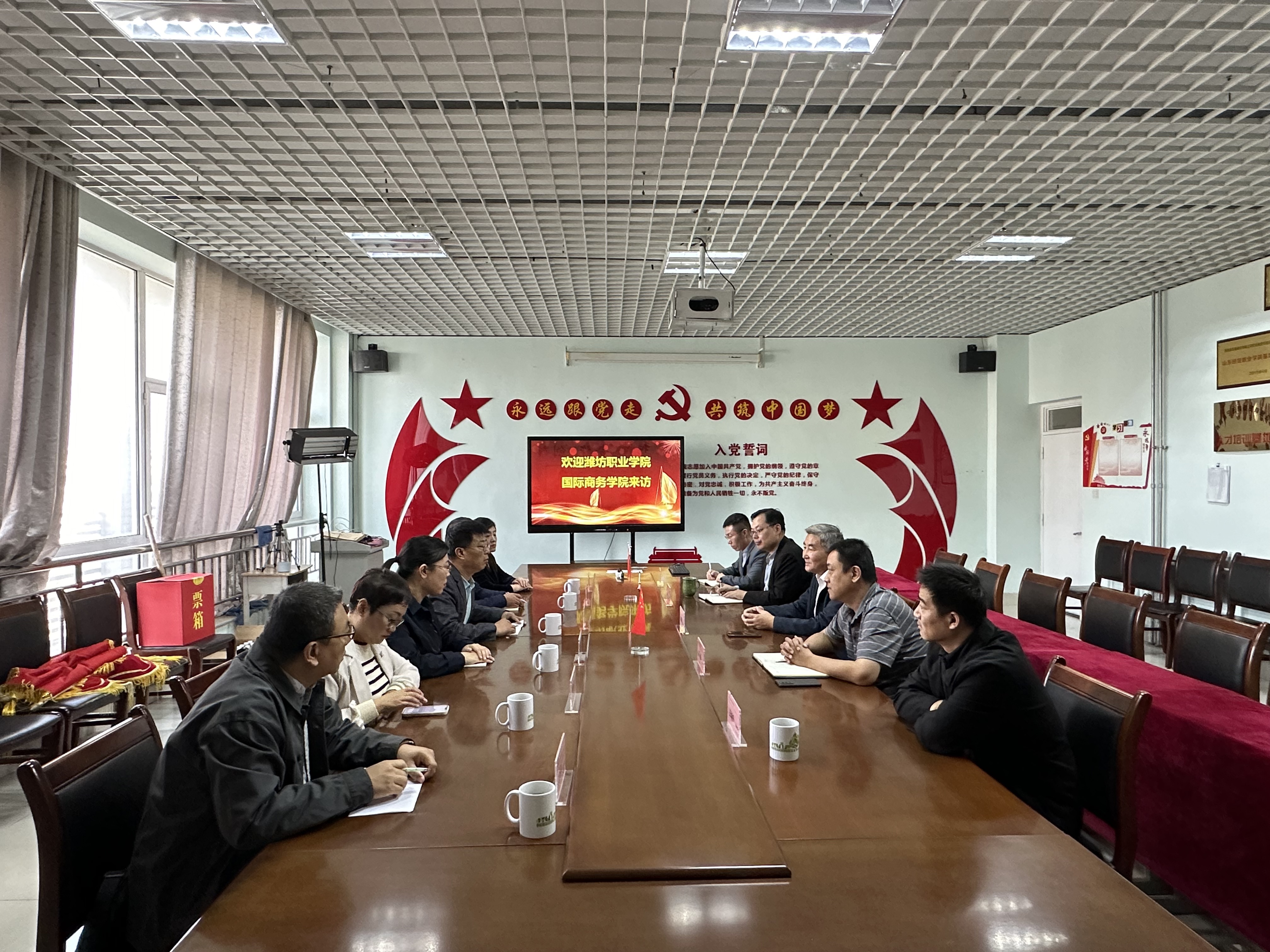 2023年10月24日,潍坊职业篮彩购买app国际商务篮彩购买app党总支副书记辛国庆,副院长黄言青、孙晓波一行六人来院交流座谈。工商管理系主任李宗顺,书记高巍,副主任高义丰,山东昊泓影视总经理王海宁参加交流座谈。