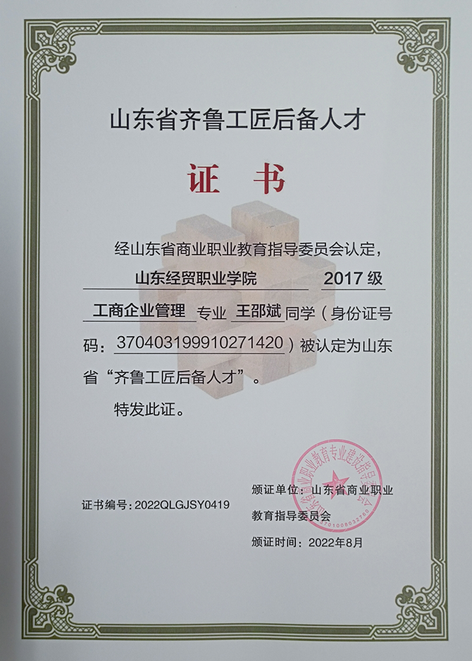 近日,经山东省商业职业教育专业建设指导委员会认定,篮彩购买app:工商管理系5名学生被认定为山东省齐鲁工匠后备人才。
