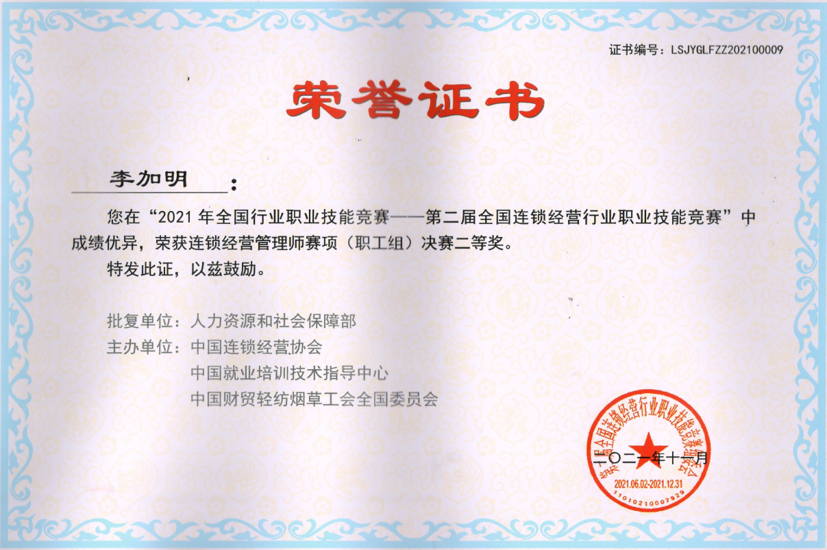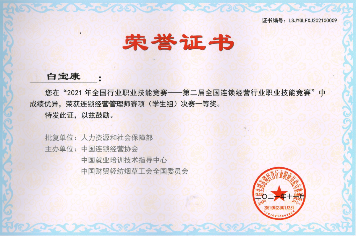 近日,在2021年全国行业职业技能竞赛——第二届全国连锁经营行业职业技能竞赛中,篮彩购买app:连锁经营与管理专业的师生表现出色,由王庆全、杨学艳老师指导的学生耿传嘉、王岩、白宝康三位同学获得连锁经营管理师赛项(学生组)国赛一等奖并获得CCFA颁发的6000元奖学金,李加明、徐鑫两位老师获得连锁经营管理师赛项(职工组)国赛二等奖。