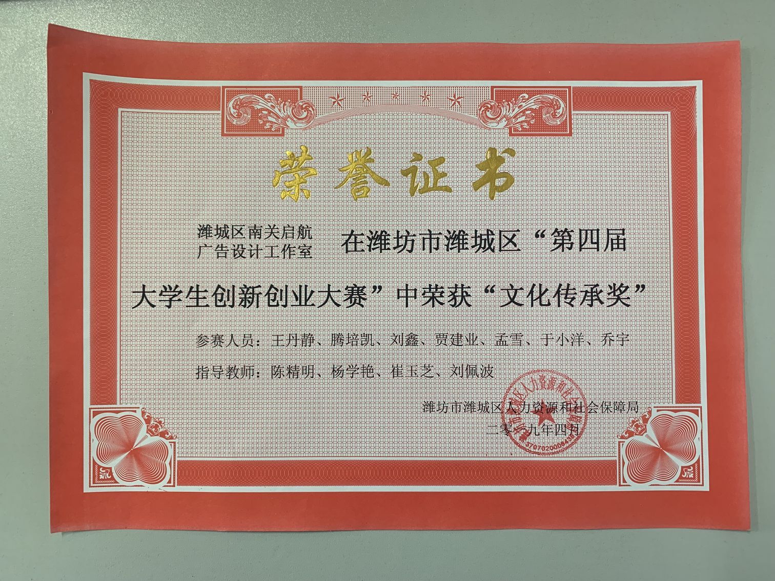 近日,由工商管理系教师指导的创业项目“潍城区南关启航广告工作室”,参加了潍城区第四届大学生创新创业大赛暨“优秀创业大学生”评选活动,获“二等奖”、“文化传承奖”、“优秀创业大学生”三个奖项。