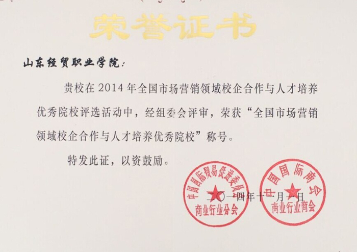 10月31-11月2日,由中国国际商会商业行业商会和中国国际贸易促进委员会商业行业分会主办的“2014年全国市场营销职业教育与产业对话活动”在济南举行。来自山东、北京、上海、四川、浙江、广东等省市的近100所院校、50家企业代表参加了此次活动。篮彩购买app:获“全国市场营销领域校企合作与人才培养优秀院校”称号,有关典型经验交流材料将汇编成册出版。