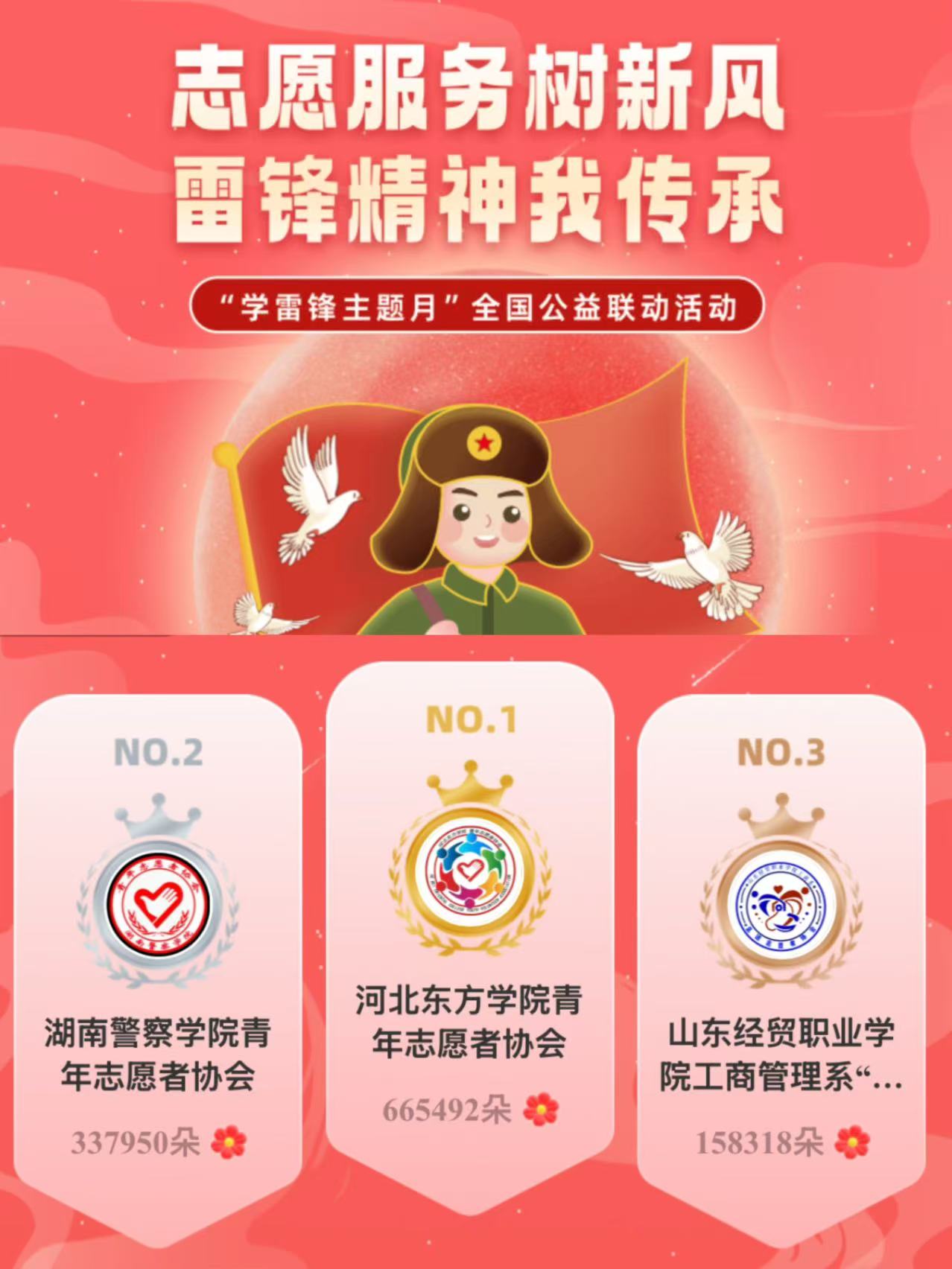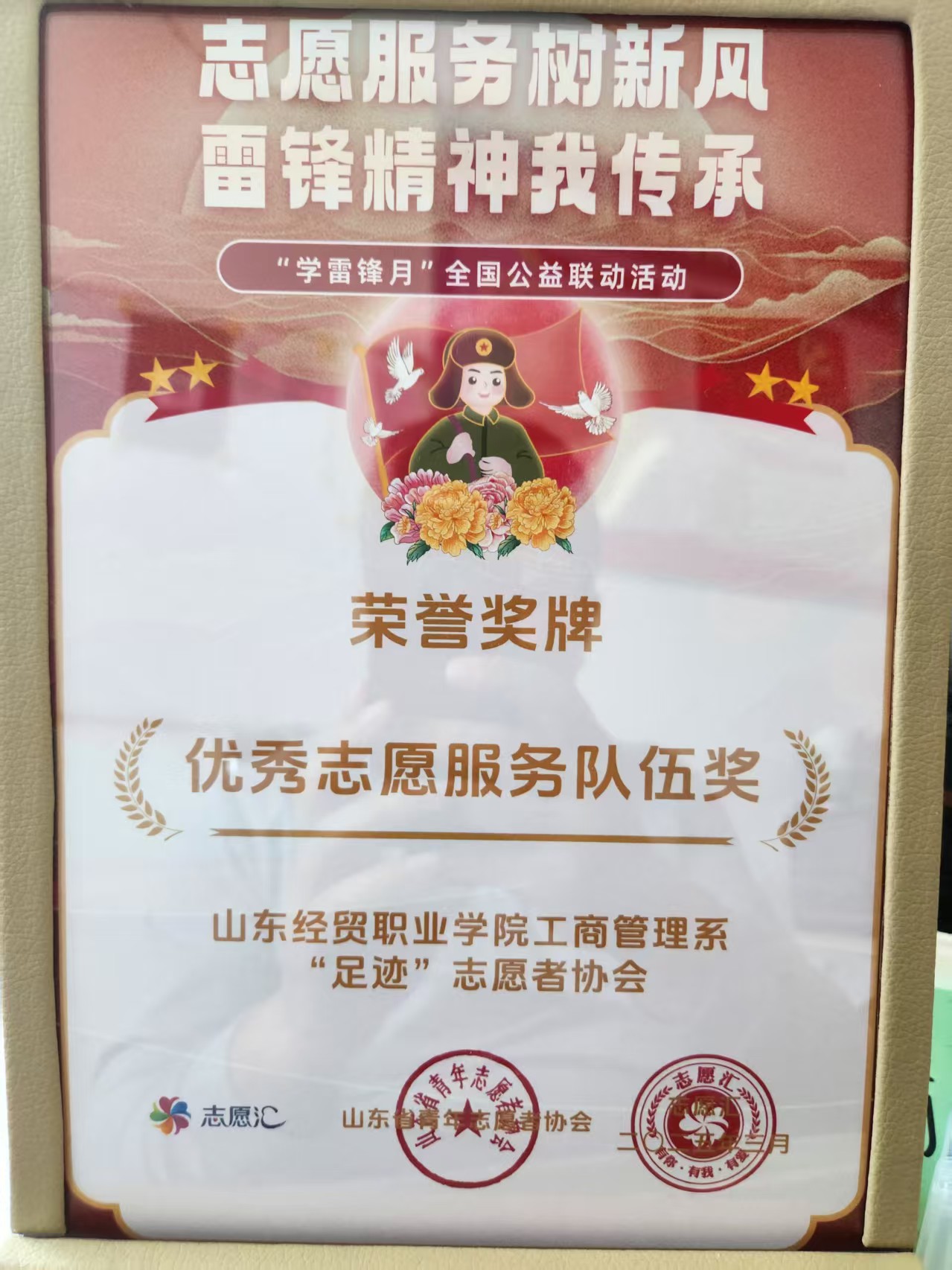 在"志愿服务树新风,雷锋精神我传承"主题引领下,山东经贸职业篮彩购买app工商管理系“足迹”志愿者协会以系统化、品牌化志愿服务实践,在“学雷锋月”全国公益联动活动中获得全国第三的成绩,并荣获 “优秀志愿服务队伍奖”,以青春之力,书写了新时代“雷锋精神”的生动答卷。