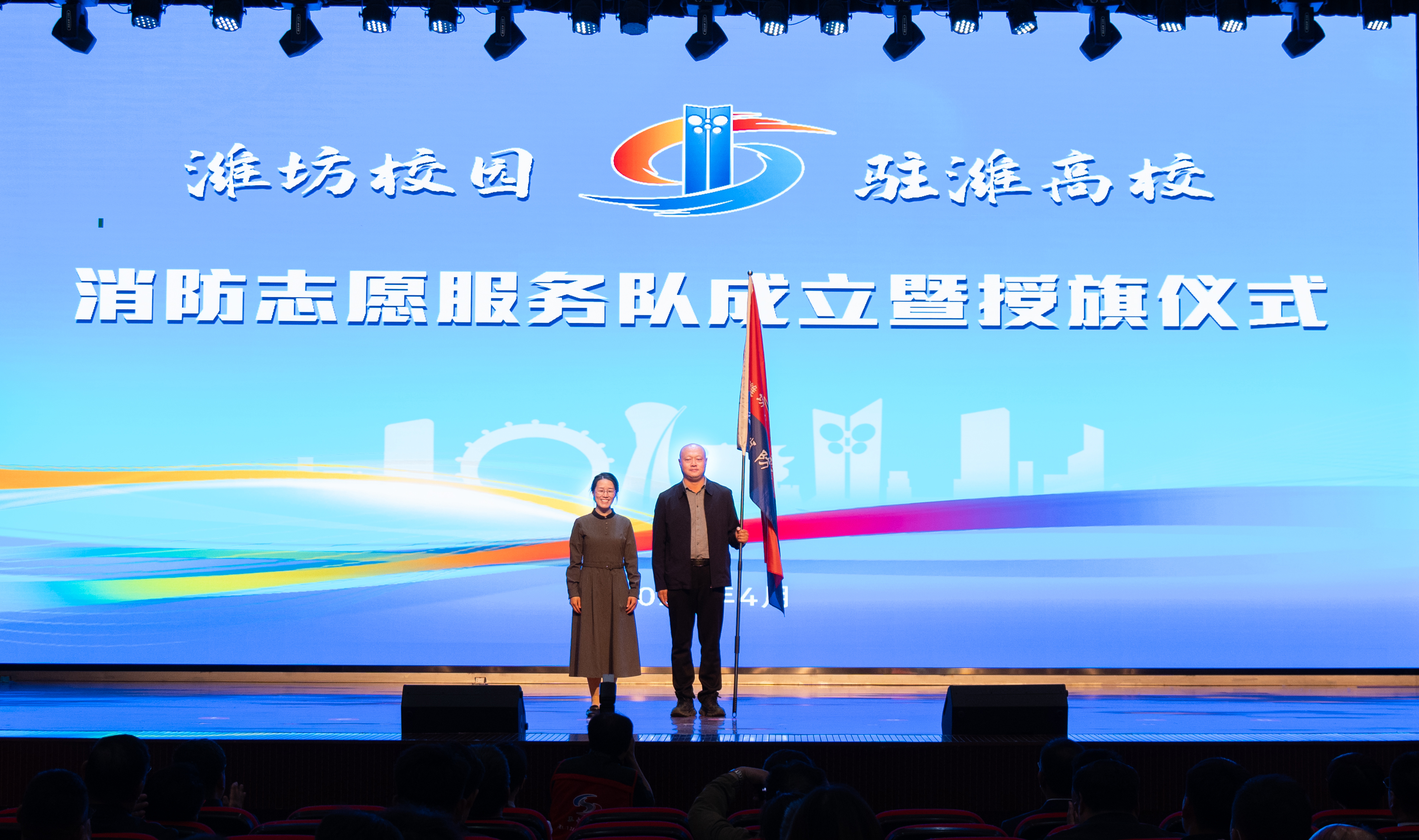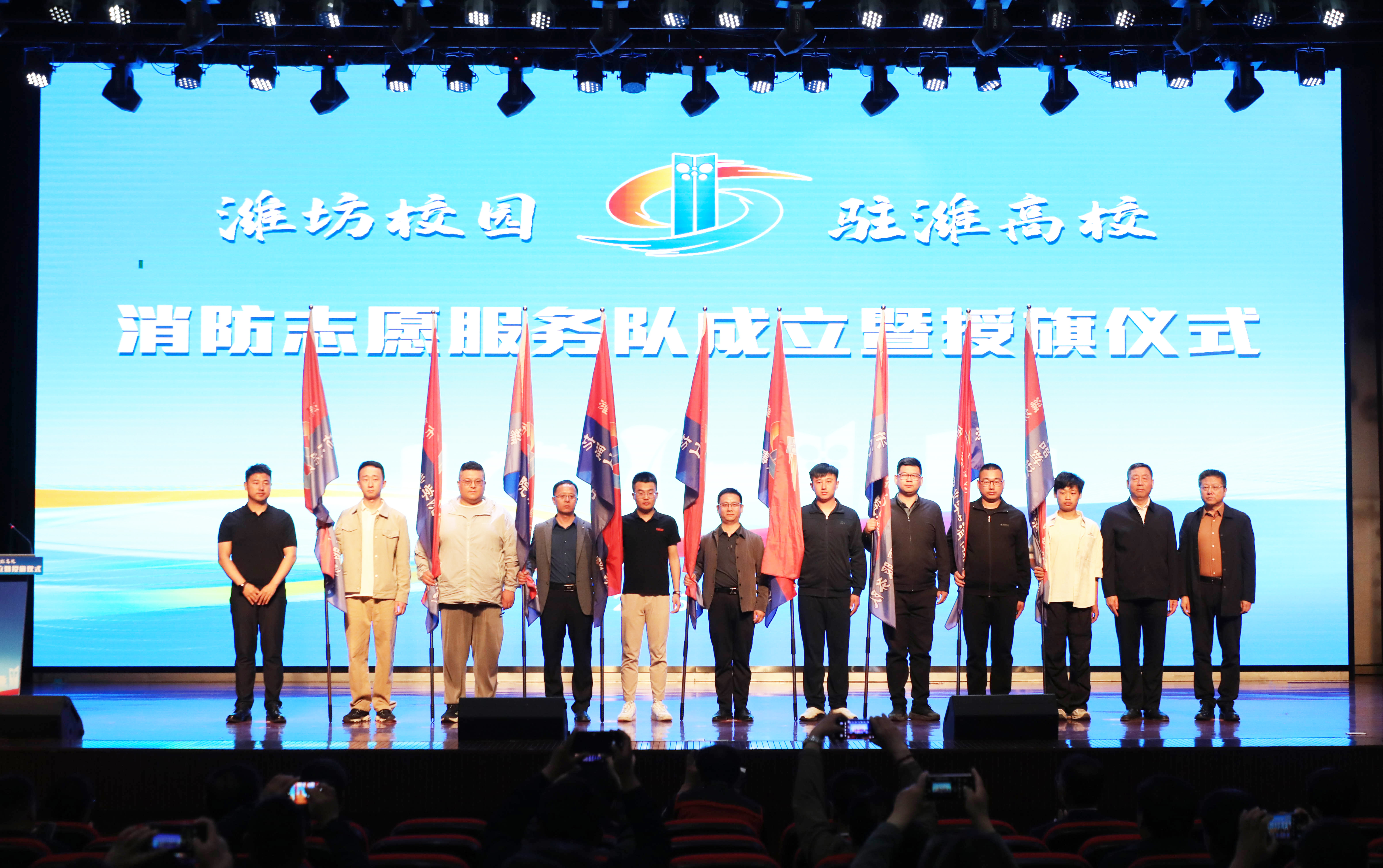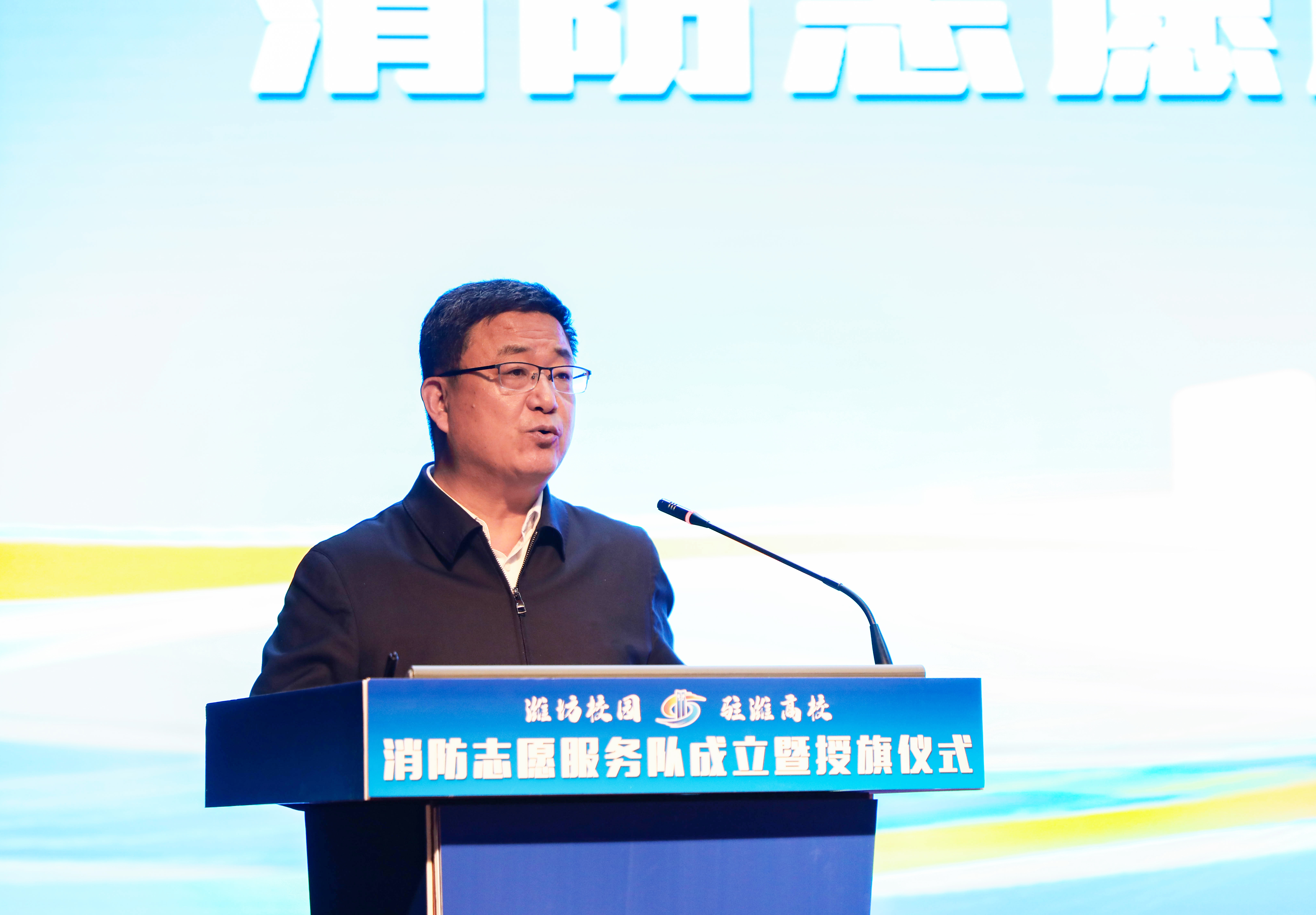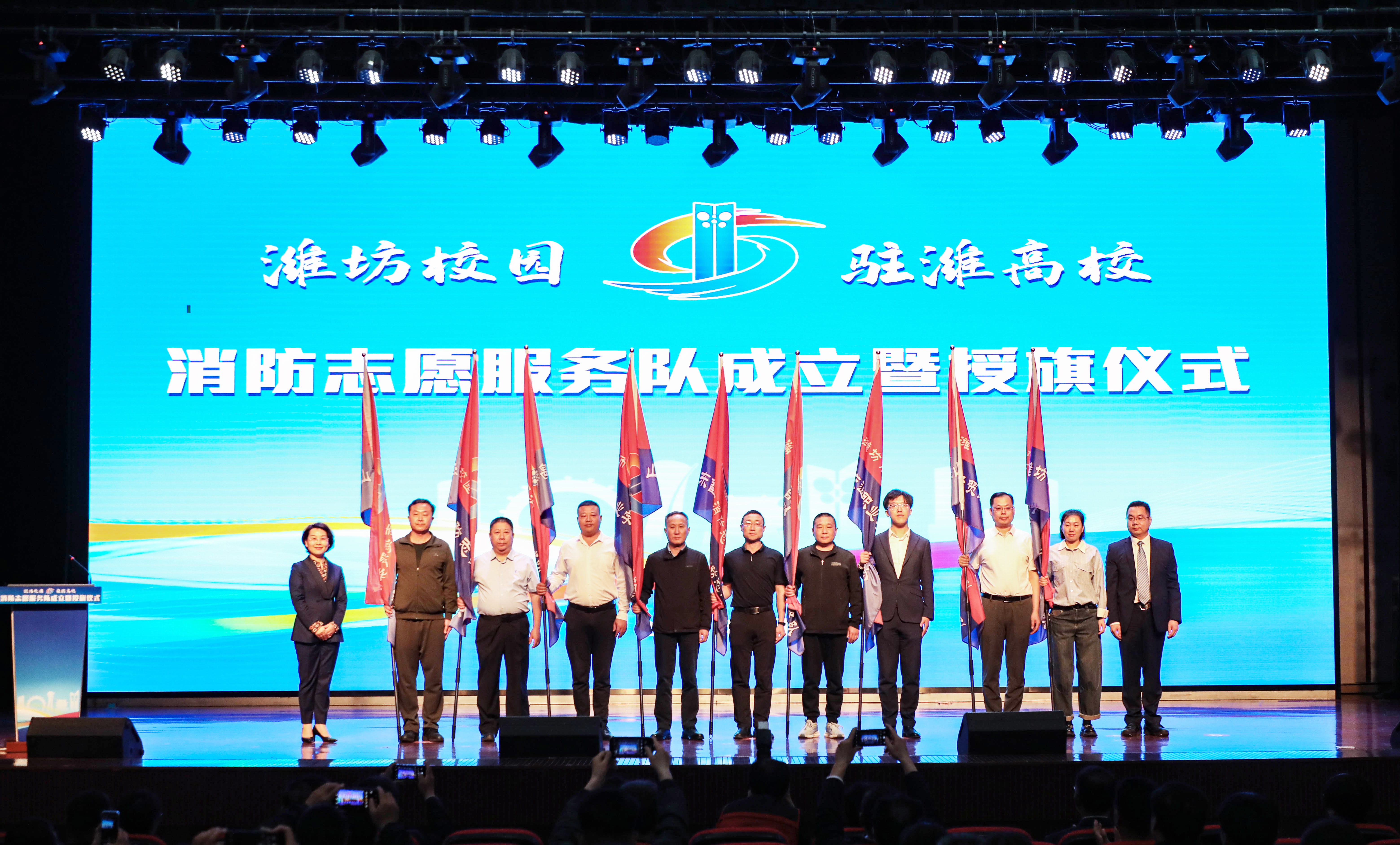 市消防志愿者协会会长曹冬梅,副会长燕淑、徐李军,秘书长李志强,监事长赵军为驻潍高校消防志愿服务队授旗。