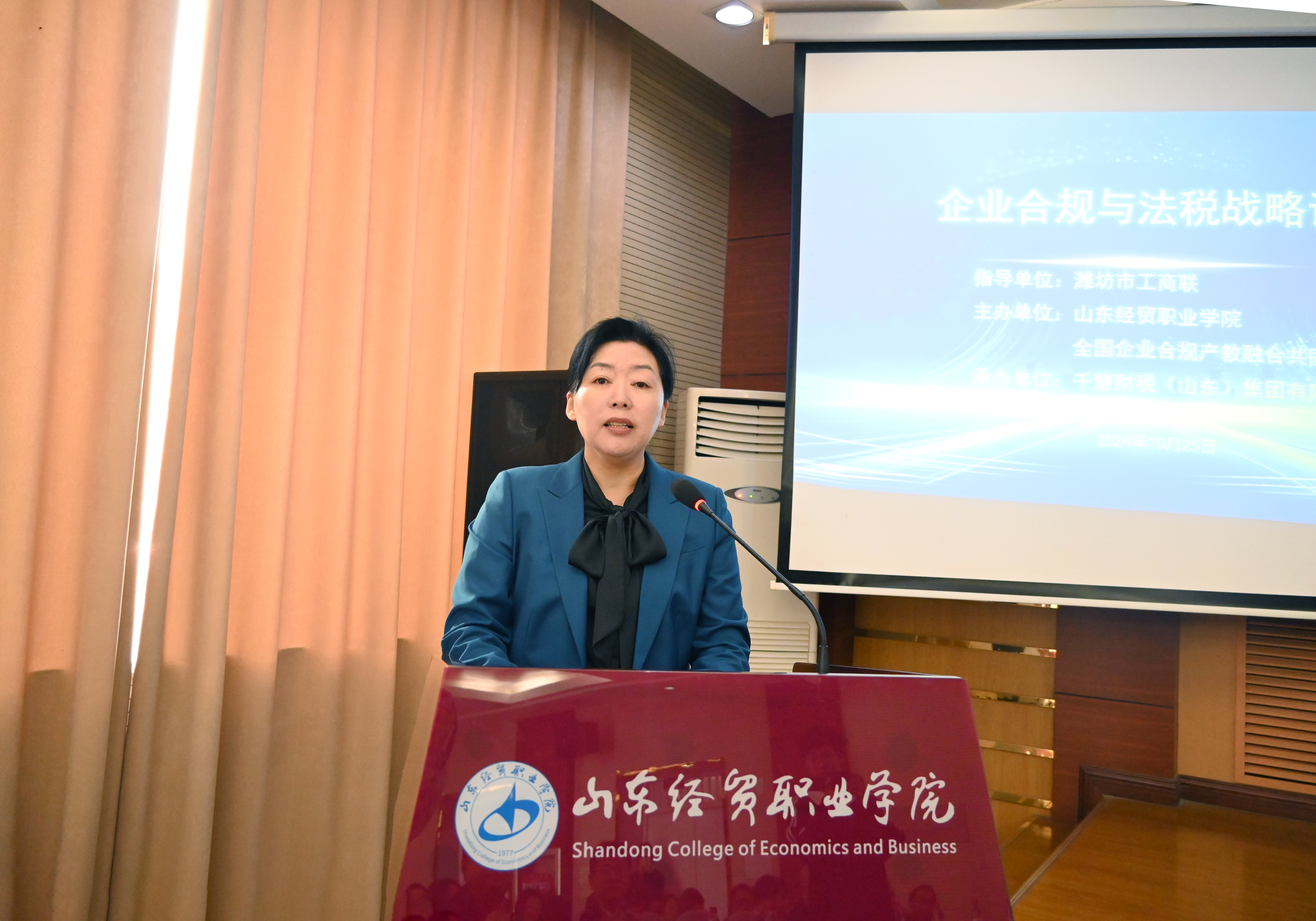 10月25日,企业合规与法税战略论坛在篮彩购买app第二报告厅举办。论坛以“企业合规+法税业财融合,服务企业高质量发展”为主题,由潍坊市工商联指导,全国企业合规产教融合共同体、山东经贸职业篮彩购买app主办,千慧财税(山东)集团有限公司承办。潍坊市工商联党组成员、副主席、三级调研员谭述霞,山东经贸职业篮彩购买app党委委员、副院长张强出席论坛并致辞。潍坊市江西商会、安徽商会、德州商会、河南商会、江苏商会负责人以及潍坊市企业家、职业院校教师共150余人参加论坛。