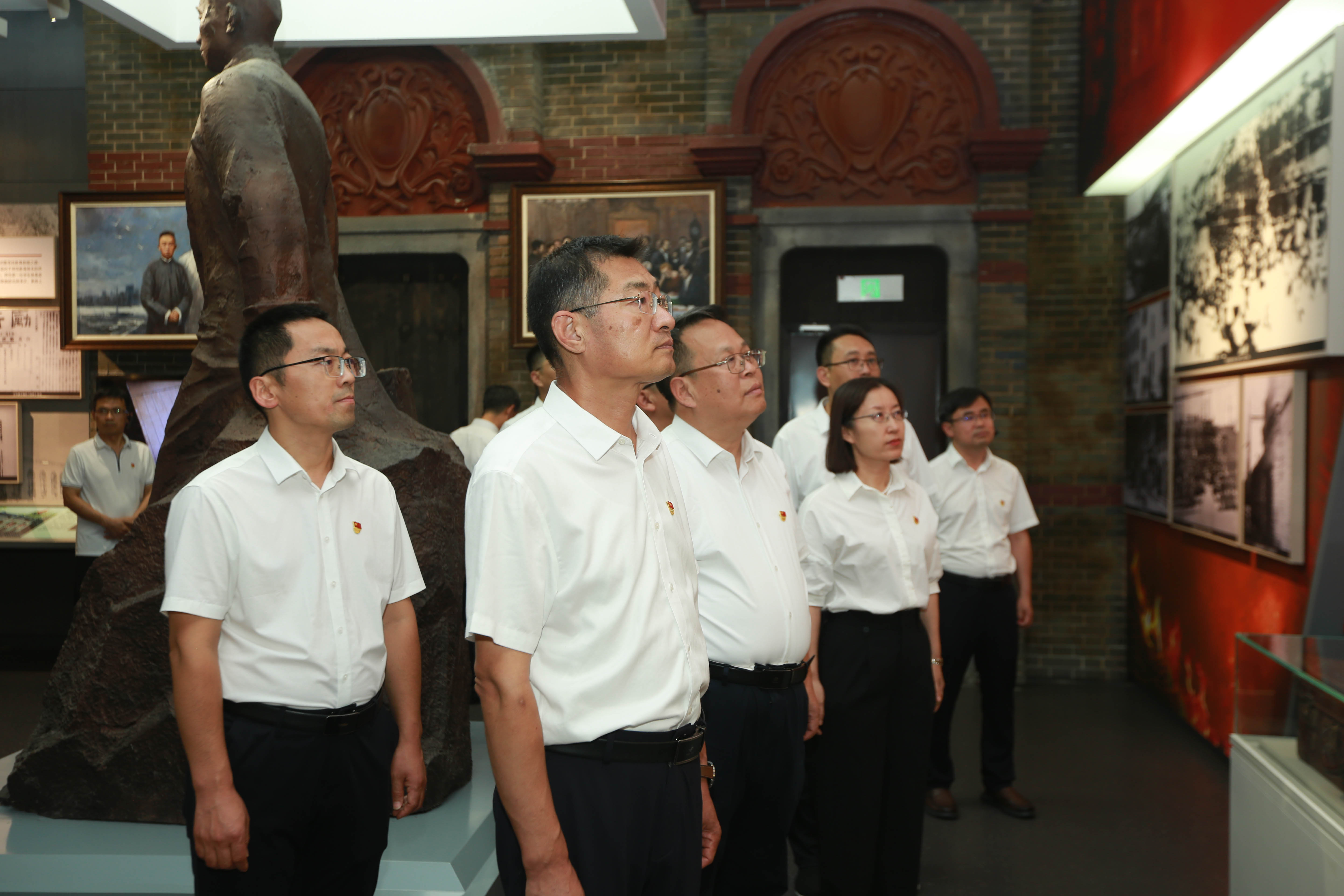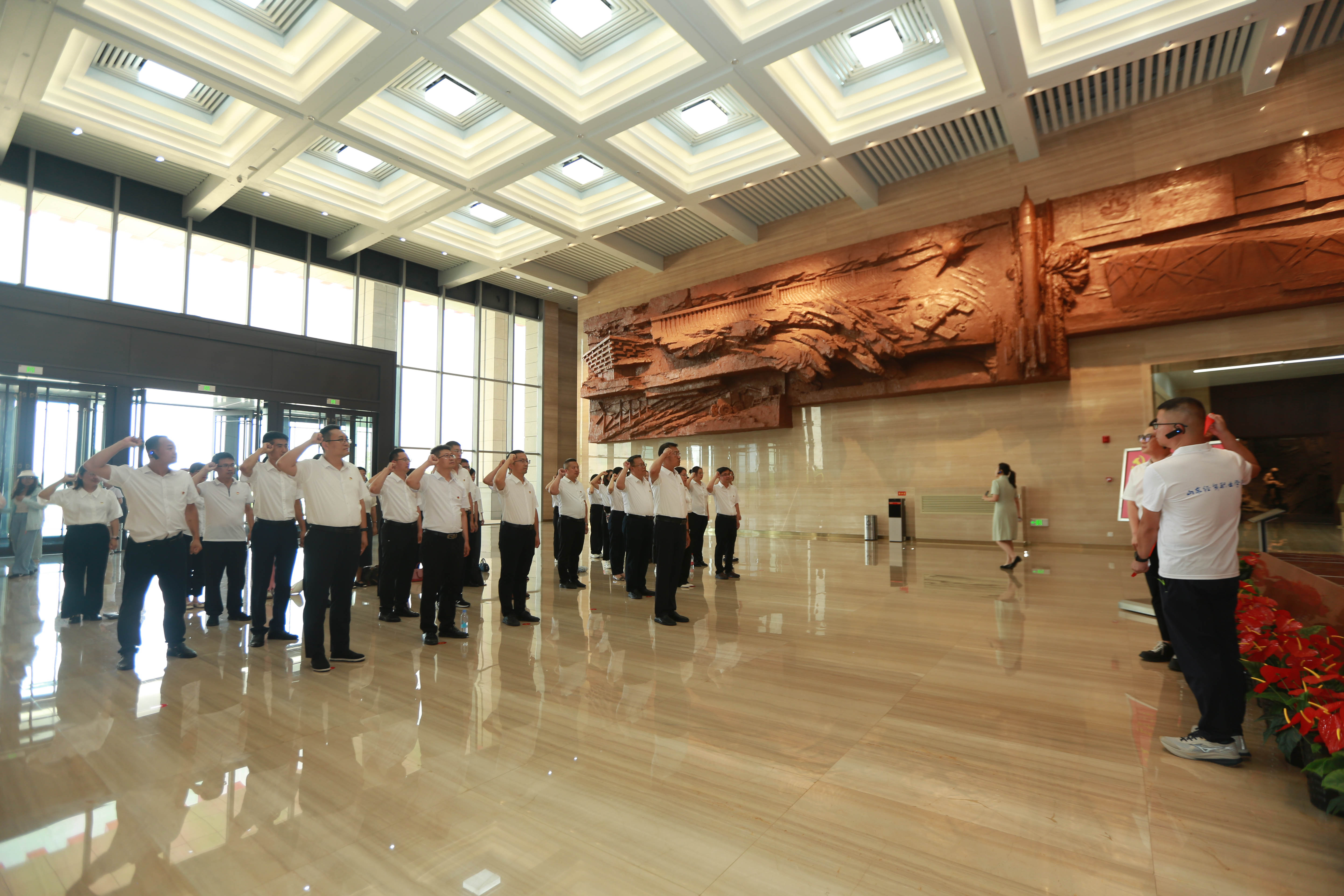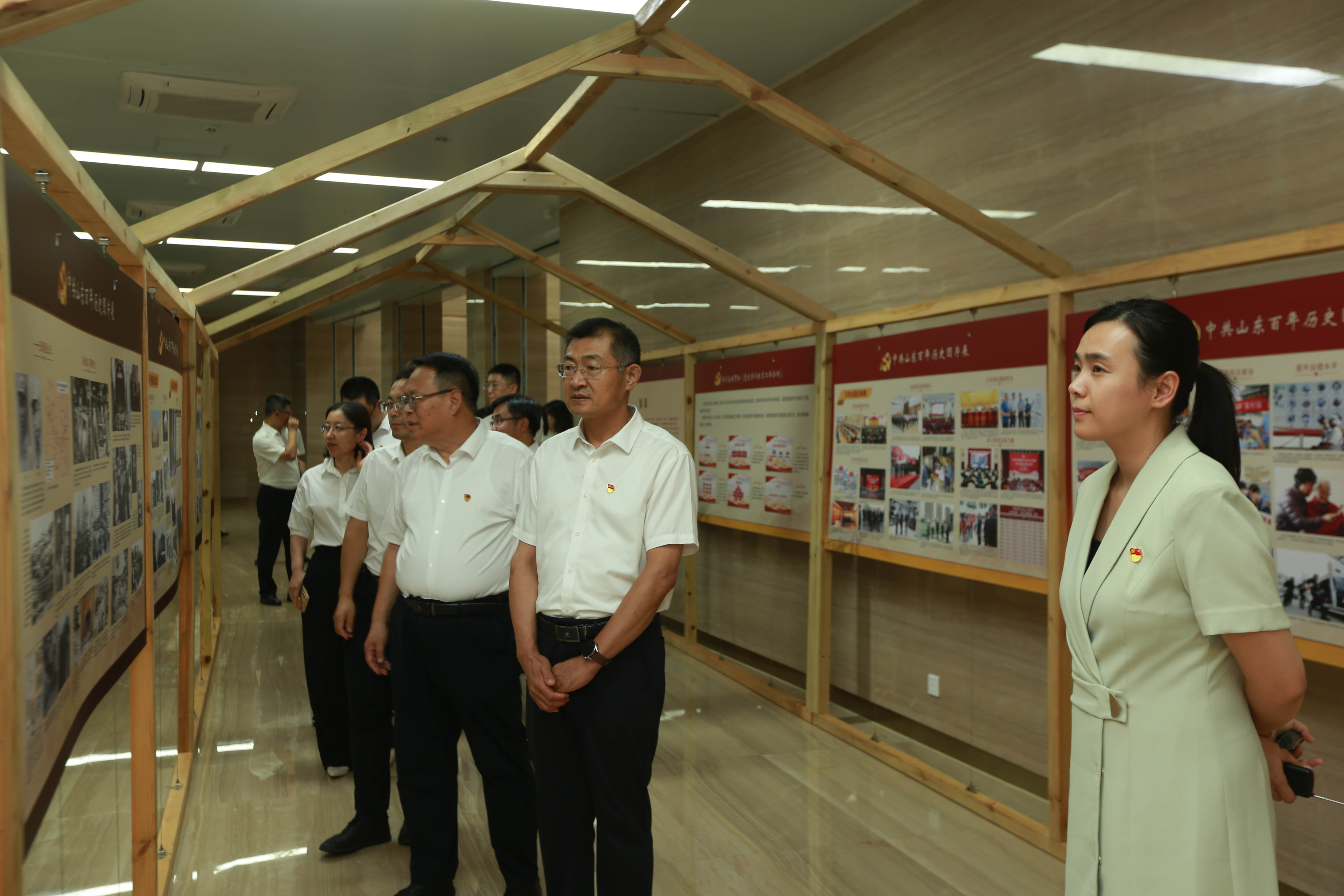 在主题展馆序厅,院长陈卫国领誓,全体党员面向党旗,庄严宣誓,重温入党誓词,决心永守初心、勇担使命。随后,跟随讲解员的脚步,大家参观了“内忧外患,勇做民族独立主心骨”等展厅及山东百年历史图片展,透过一件件珍贵文物和生动的影像、图片,全体党员望向历史的最深处,感悟老一辈共产党员为革命事业及建设事业抛洒热血、不怕牺牲的精神,一次次被触动、被震撼。