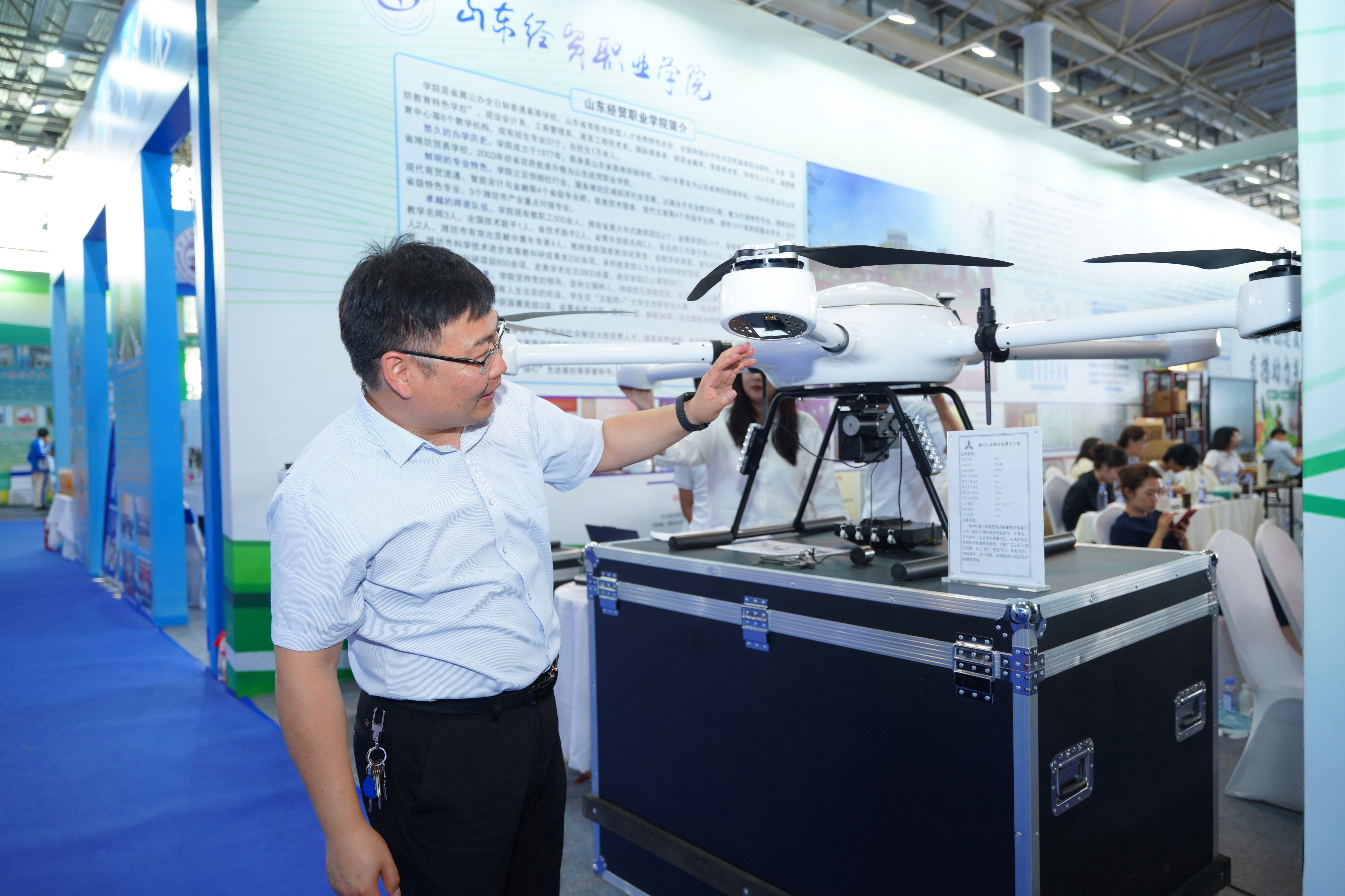 唰唰唰,钞票在指尖飞速划过,数据已了然于胸,四种点钞技法与传票翻打在展位循环展示,同学们熟练的指法令人称奇,也吸引了不少体验者前来“踢馆”,上手挑战点钞,与同学们交流学习点钞技能。点钞区旁,两架大型无人机与视频相配合,展示了其在物流运输、教练飞行、紧急医疗救援等方面的广泛应用。在中心展区,图像三维重建展示则通过三部相机采集实物商品图像,并利用3D建模技术构建3D模型,帮助顾客在网购时实现试穿试戴试用等前置体验,展现了计算机技术技能人才的技术优势。