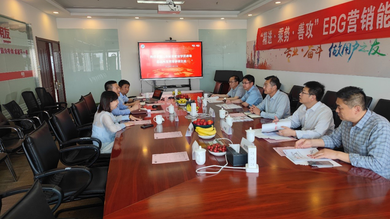 用友山东分公司副总经理原嫄、用友新道山东分公司总经理法宁等热情接待,并详细介绍了公司规模、企业文化、发展历程以及校企合作路径等。结合用友集团的人才需求特色,校企双方就数智化人才培养展开了深入交流。