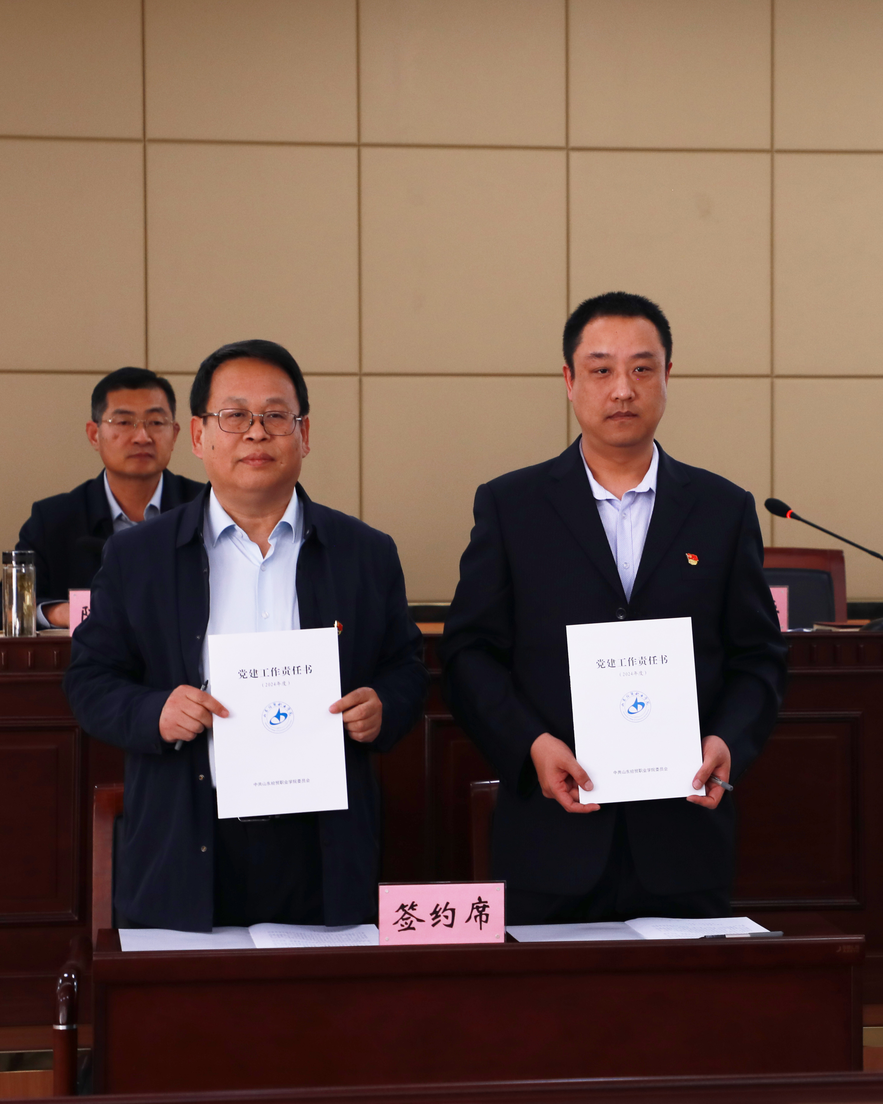 陈卫国与党委成员、副院长马起朋、张强,王炳华与基层党组织代表工商管理系党总支、科研与社会服务党支部分别签订《党建工作责任书》和《党风廉政建设责任书》。