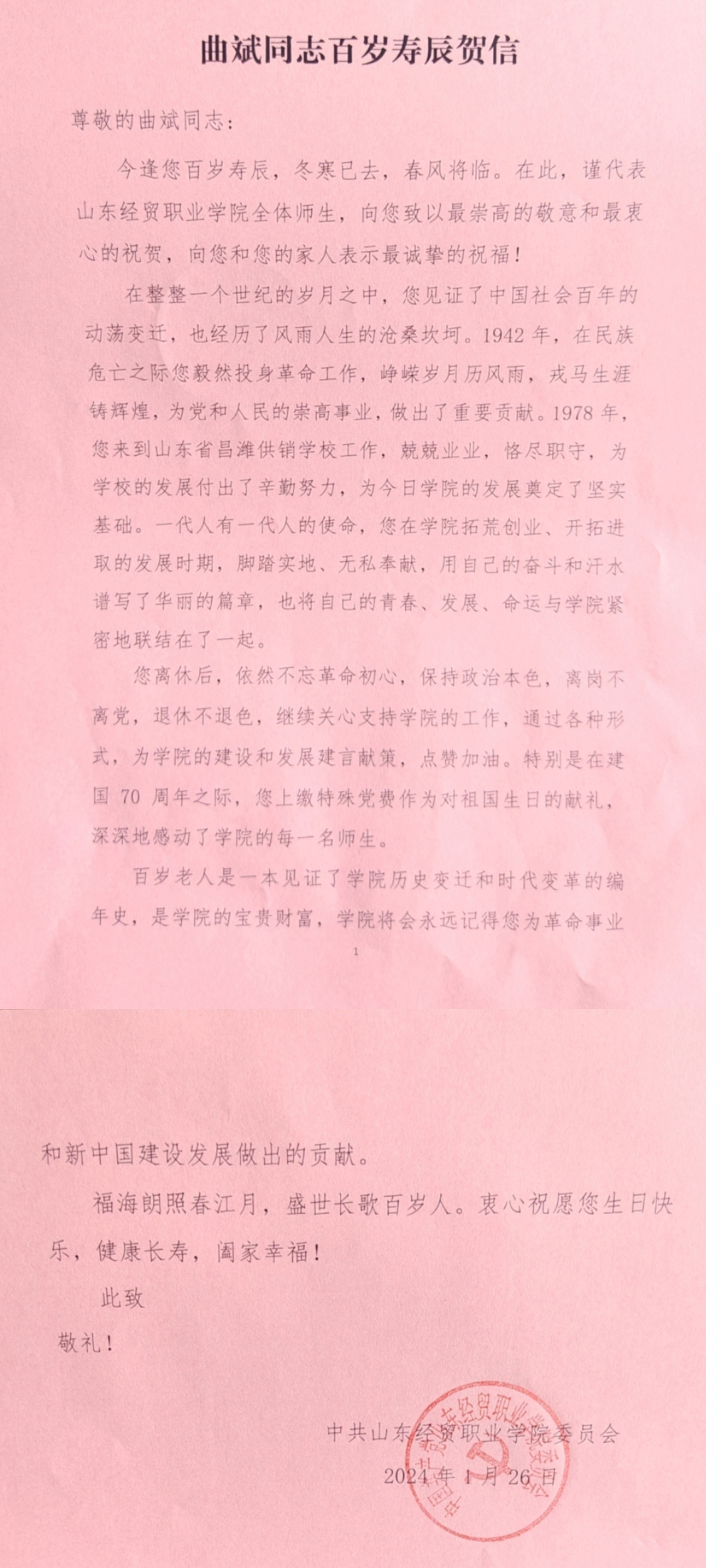 陈卫国代表篮彩购买app送去贺信、篮彩购买app发展成果材料和慰问金,对曲斌同志百岁寿辰表示最诚挚的祝福,同时向曲斌同志及家人致以节日问候,对他们为篮彩购买app建设付出的努力和关心支持篮彩购买app发展表示感谢。