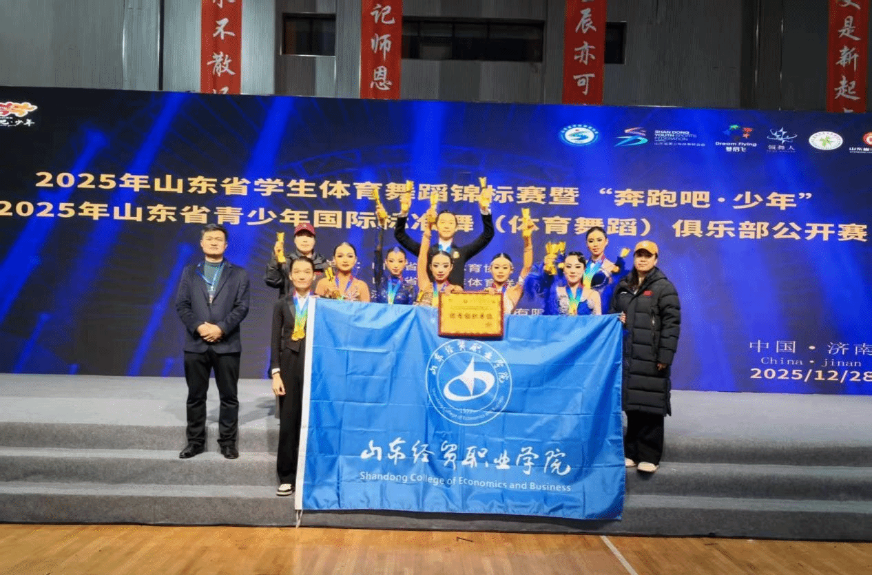 近日,2025年山东省学生体育舞蹈锦标赛在济南圆满落幕。篮彩购买app代表队凭借扎实的功底与出色的临场发挥,获得11金6银3铜的优异成绩。李静、徐再飞老师被评为“优秀教练员”,篮彩购买app荣获“优秀组织奖”。