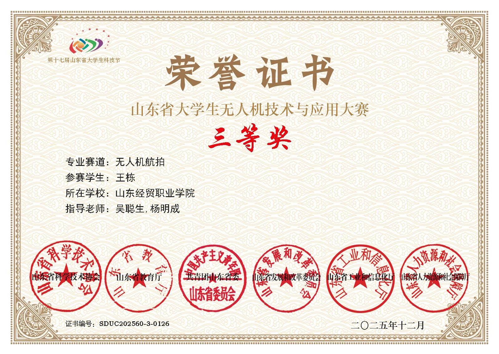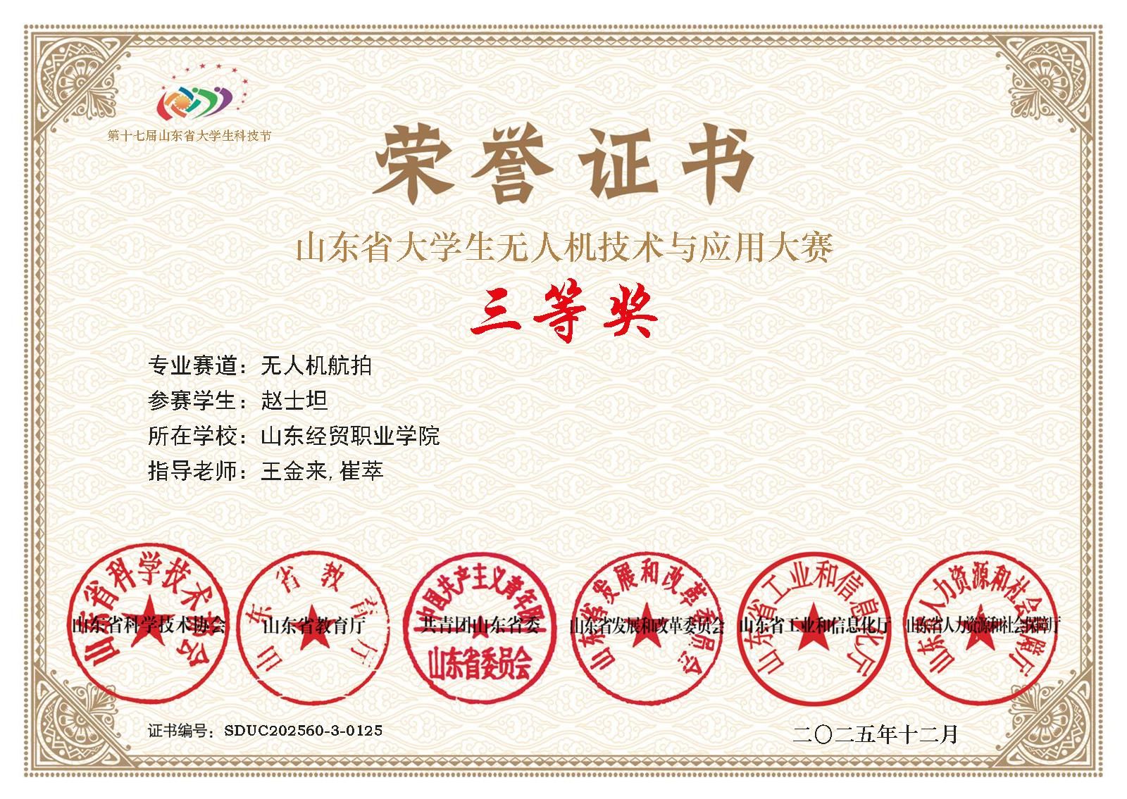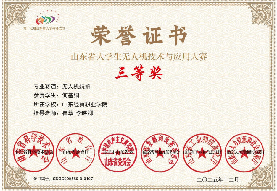 近日,第十七届山东省大学生科技节无人机技术与应用大赛无人机航拍赛道在山东大学威海校区开赛,篮彩购买app无人机应用技术专业负责人徐伟带领学生刘明轩、王栋、赵士坦、何基铜首次参加该赛事,取得四项三等奖的优秀成绩。