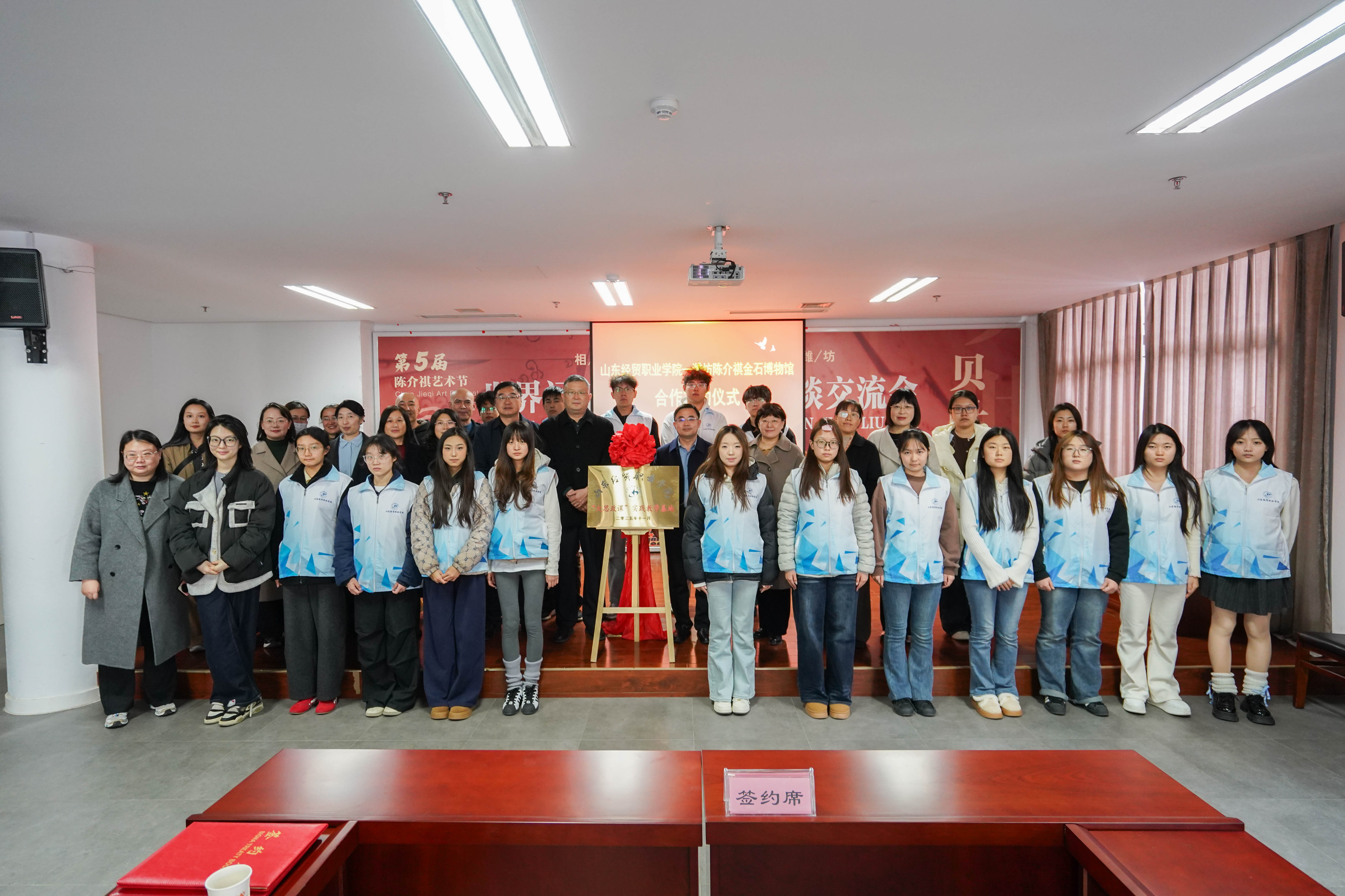 李海娜与陶琦签署馆校战略合作框架协议,刘涛与赵继民为“山东经贸职业篮彩购买app大思政课实践教学基地”揭牌。