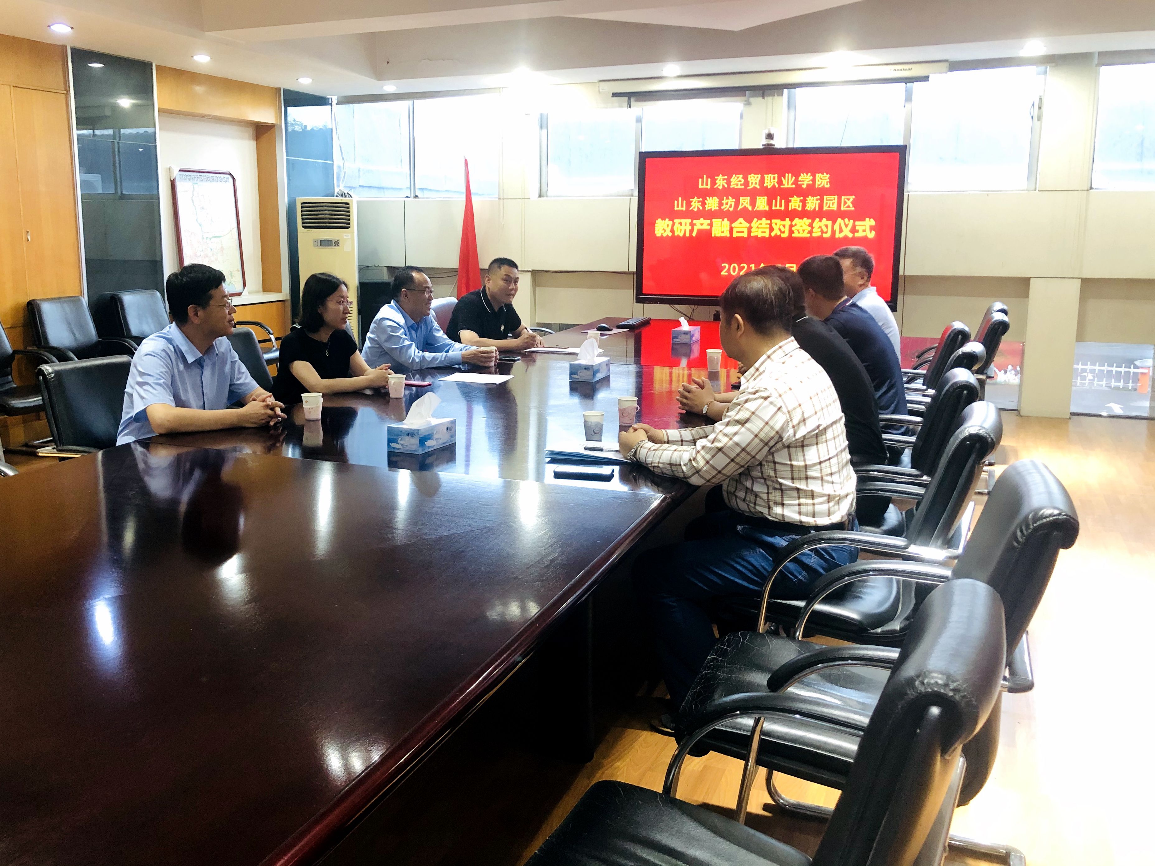 6月17日下午,篮彩购买app与山东潍坊凤凰山高新园区教研产融合结对签约仪式在坊子区凤凰街办会议室举行。凤凰街道办事处主任房军伟,凤凰街道党工委副书记李清华,高新园区管委会副主任李伟,高新园区经贸发展中心主任刘洪文等相关领导,以及篮彩购买app教务处处长刘莹,会计系主任侯君邦出席签约仪式。
