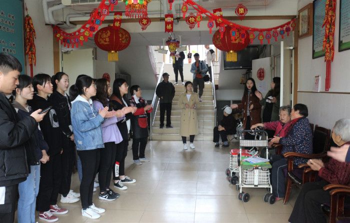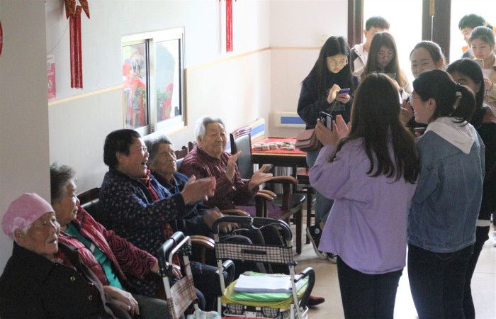 志愿者们分头行动,有的打扫楼层和庭院卫生;有的陪老人拉家常讲故事;有的搀扶着老人到院里散步、谈心;有的为老人表演节目,高亢激昂的《歌唱祖国》,诙谐幽默的小品表演,俏皮可爱的舞蹈《小苹果》。志愿者的到来让原本安静的老年公寓充满了欢声笑语。