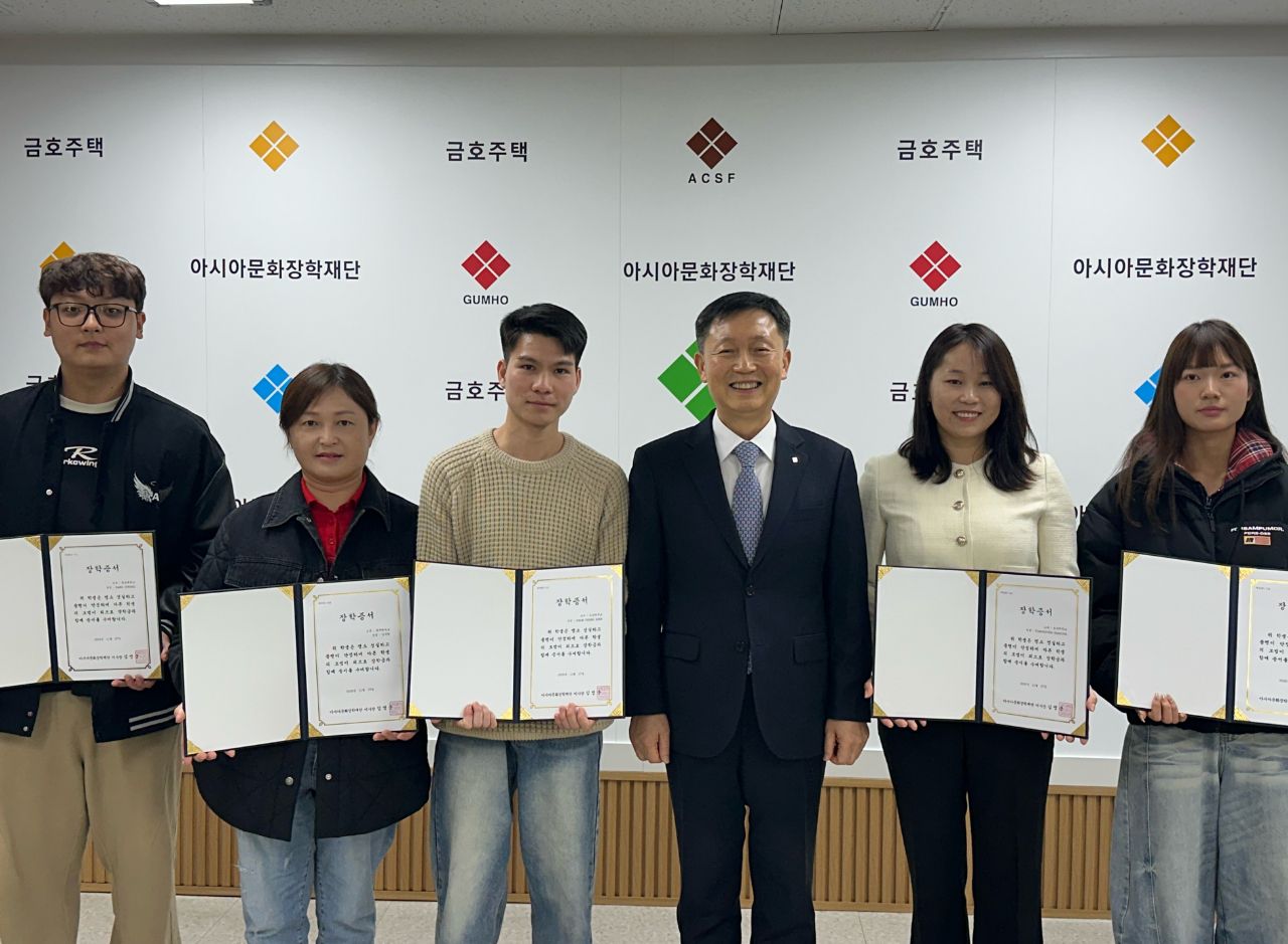 颁奖仪式后,臧浚皓同学与亚洲文化奖学财团理事长金明俊和与其他获奖学子亲切合影,共同留念。