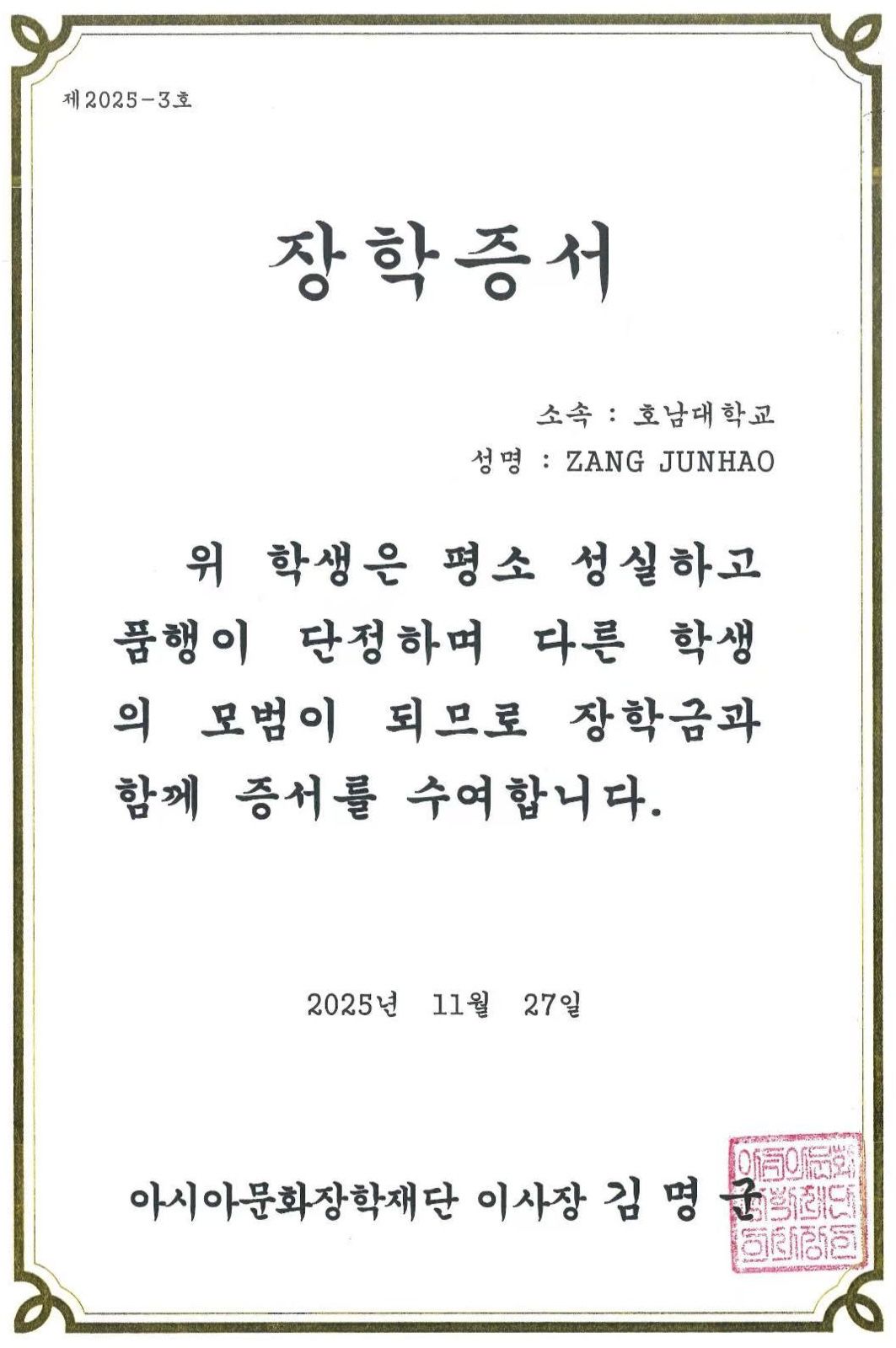 近日,山东经贸职业篮彩购买app2022级会计中外合作办学班班长臧浚皓同学传来捷报。在韩国湖南大学2025-2026学年第一学期的评选中,他凭借优异的学业表现与突出的综合素养,被授予“优秀留学生代表”荣誉称号,同时斩获100万韩元专项奖学金,获奖证书及奖学金已正式发放。