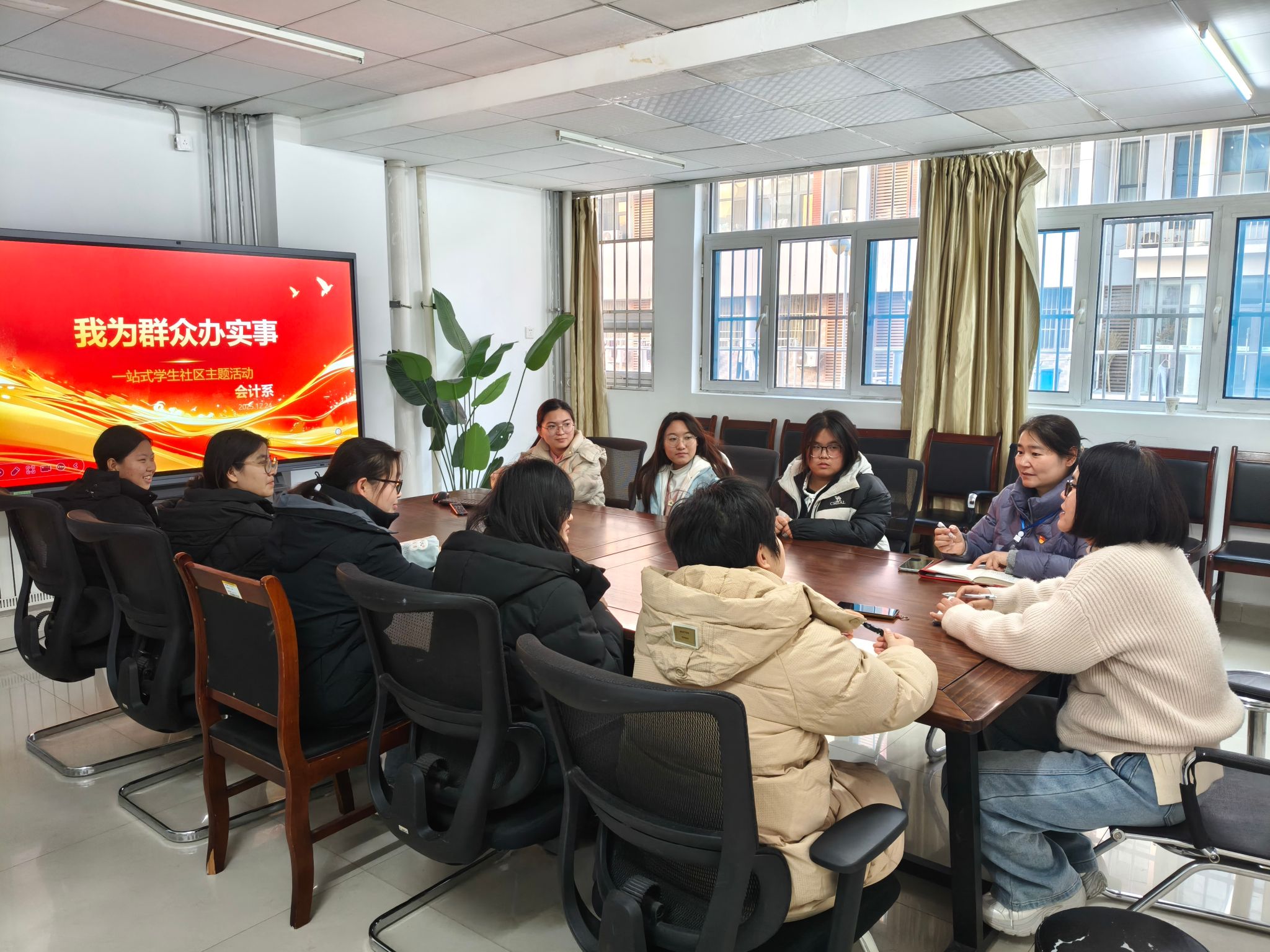 为扎实推进 “我为群众办实事”实践走深走实,紧扣 “三全育人”实践要求,12月24日下午,会计系以学生社区为阵地召开以“我为群众办实事”为主题的座谈会,会计系师生代表50余人参加活动。辅导员与学生代表面对面交流,切实打通服务学生的“最后一公里”。