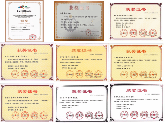 先后获得世界职业院校技能大赛铜奖1项,全国职业院校技能大赛三等奖2项,山东省职业院校技能大赛一等奖5项,二等奖9次,获得全国大学生会计信息化技能大赛、全国职业院校沙盘模拟经营大赛、全国管理会计技能大赛、全国审计技能大赛等各种技能大赛奖励100余项。先后承办了山东省第一、二、届职业院校技能大赛高职组“会计技能”赛项,山东省第十八届职业院校技能大赛高职组财经赛道,第十、十一届山东省大学生科技节企业管理信息化竞赛,五届山东省职业院校技能大赛“沙盘模拟企业经营”(中职组)赛项,山东省大学生科技节暨第四届山东省大学生人工智能大赛RPA财务机器人赛项、山东省“技能兴鲁”职业技能大赛-人工智能技术创新应用职业技能赛项等大赛,多次被山东省科协、教育厅等部门评为优秀组织单位,承办各项大赛期间,组织得力,秩序井然,获得了参赛院校的一致好评。