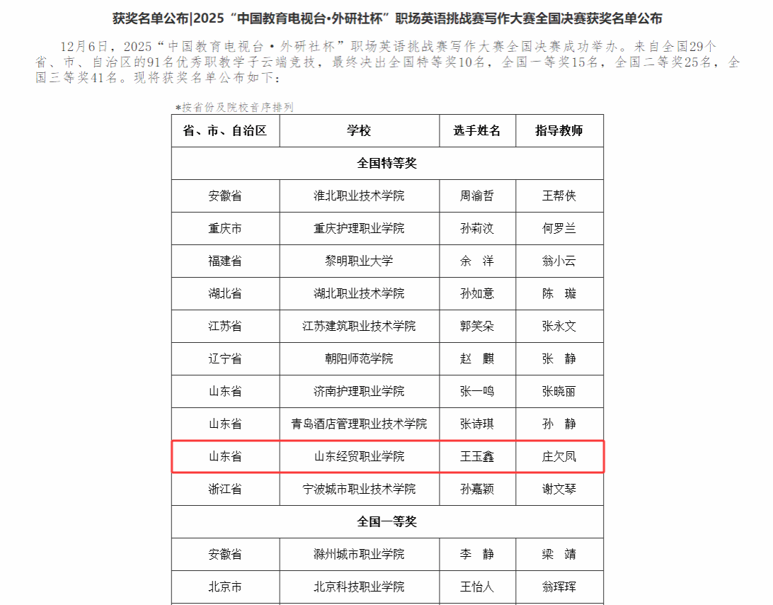 近日,2025“中国教育电视台·外研社杯”职场英语挑战赛写作大赛全国总决赛于云端成功举办并圆满落幕。经过激烈角逐,篮彩购买app庄欠凤老师指导的财政金融系大数据与财务管理专业的王玉鑫同学凭借出色表现,从全国29个省、市、自治区的91名优秀选手中脱颖而出,荣获全国总决赛特等奖,实现了篮彩购买app在该赛事中的历史性突破。