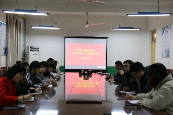 12月13日晚7点,商务工程技术系在系二楼会议室召开新老学生干部工作经验交流会。系党总支书记郭启瑞出席会议并发言。部分辅导员老师、新老两届学生会主席团成员参会,学生科科长王磊主持。