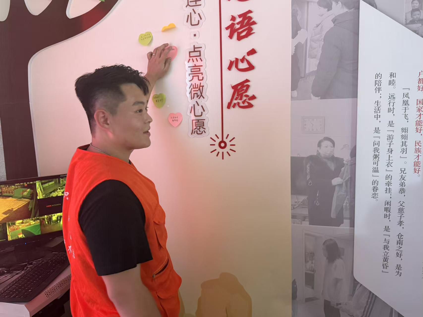 活动伊始,志愿者们便化身“暖心助手”,将便利贴与彩笔递到老人手中,视力欠佳的老人,他们轻声询问心愿,逐字逐句协助记录。“祝祖国越来越富强”“盼孙子中秋回家吃顿团圆饭”“愿邻里都平平安安”…… 老人们握着笔,有的一笔一划认真书写,有的边想边念叨,朴实的文字里满是对祖国的赤诚与对家人的牵挂。五颜六色的便利贴层层叠叠,汇聚成一片温暖的“心愿海洋”,成为现场最动人的风景。