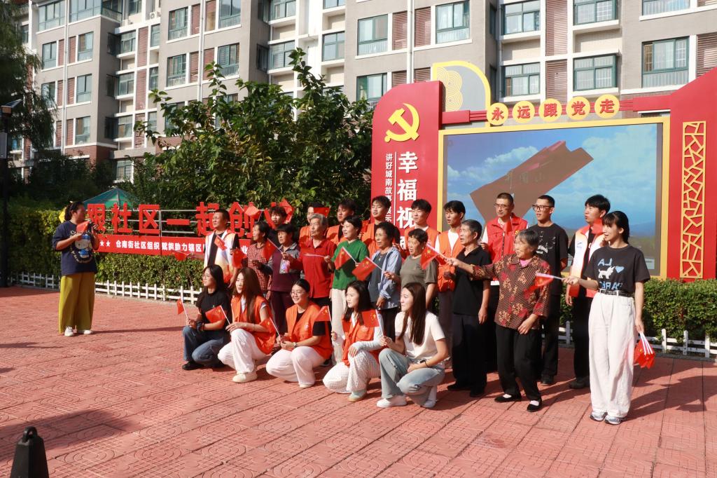 “五星红旗迎风飘扬,胜利歌声多么响亮……”当《歌唱祖国》的旋律响起,活动瞬间推向高潮。志愿者们率先举起手中的小红旗,老人们也跟着挥动起红旗,有的老人虽因年岁高记不全歌词,却跟着节奏轻轻哼唱,浑浊的眼眸里闪着光亮;有的志愿者主动牵起老人的手,用昂扬的歌声传递炽热的爱国情,路过的社区居民也被氛围感染,驻足加入合唱队伍。激昂的歌声在社区院落里回荡,每一句都饱含对祖国的祝福,每一面挥动的小红旗都映着家国同庆的荣光,现场庄重而热烈。
