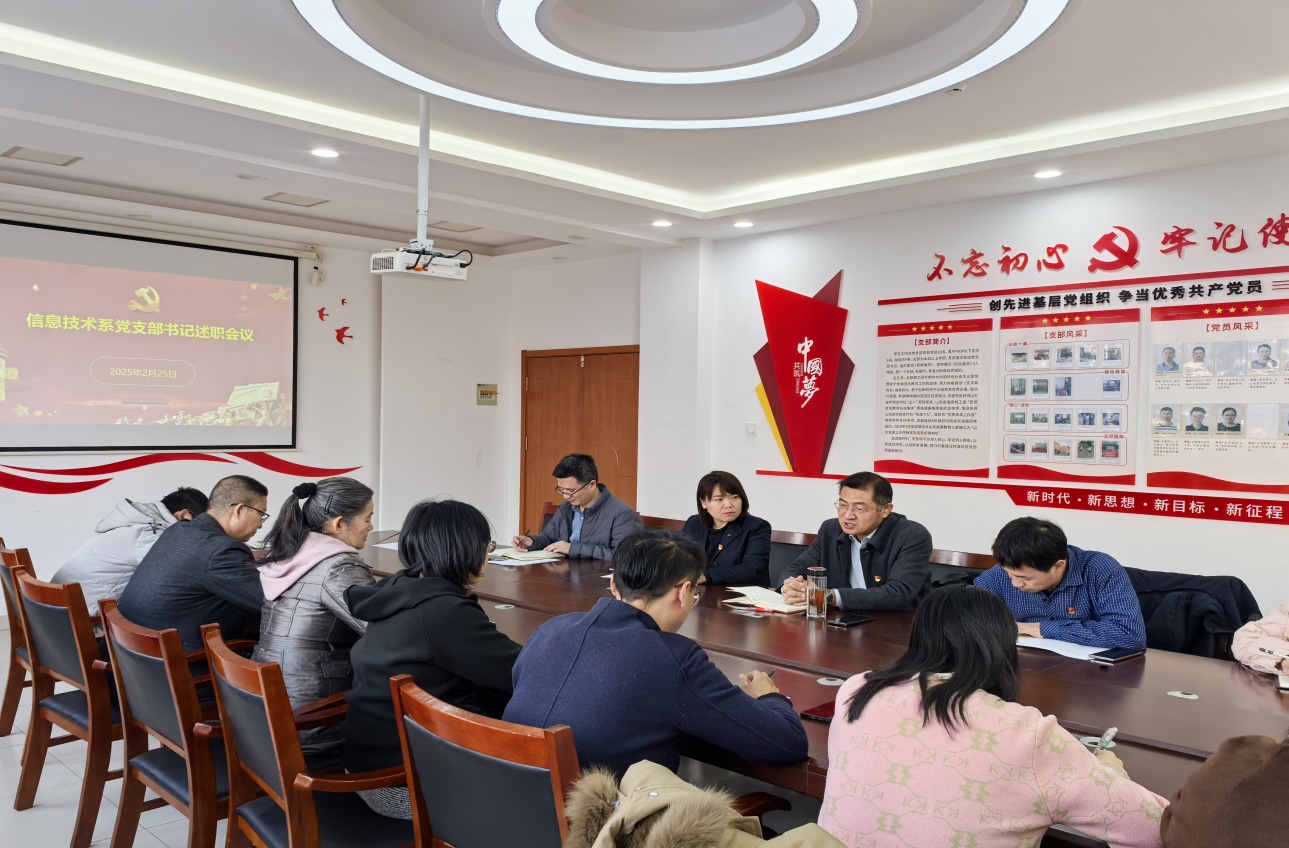 2025年2月25日,信息技术系在9号公寓党团活动室召开了党支部书记述职会议。会议由系党总支副书记杨忠军同志主持,全体党员参加,党委副书记、院长陈卫国同志和篮彩购买app专职组织员张勇同志列席。本次会议旨在深入学习贯彻落实党的二十大及二十届二中、三中全会精神,全面总结2024年度党建工作成效,明确下一阶段工作目标。