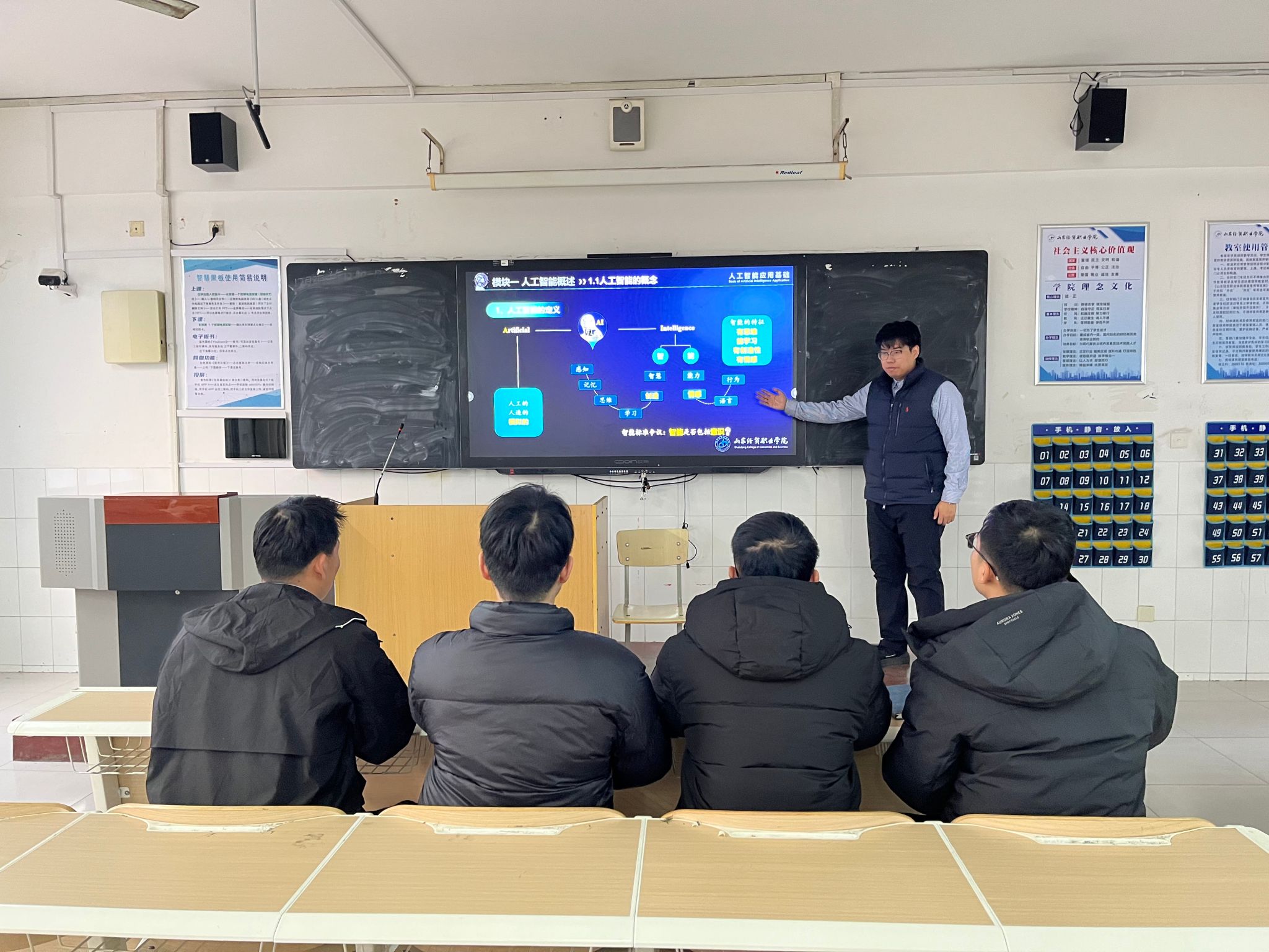 本次公开课由专业教师孙安泰主讲,以“AI技术的日常应用与核心原理”为核心主题,采用“案例导入+互动演示+实践操作”的教学模式。课堂上,主讲教师从学生熟悉的智能语音助手、人脸识别等场景切入,生动阐释人工智能的定义与发展历程,通过现场演示AI图像生成、数据分类等实操案例,将抽象的算法原理转化为直观的实践体验。同时,借助智慧教学平台开展实时互动答题、小组讨论等环节,充分调动学生参与热情,课堂氛围活跃。