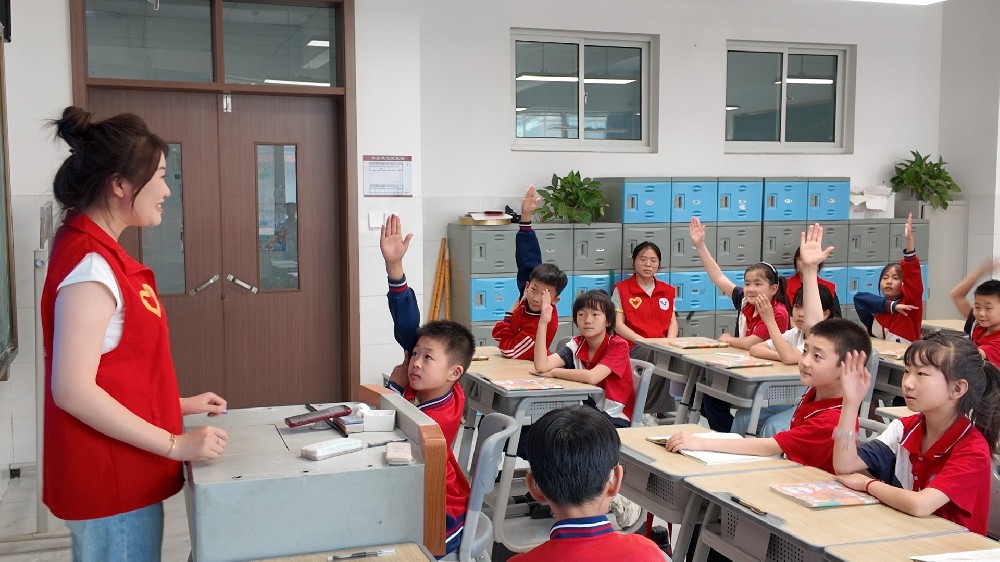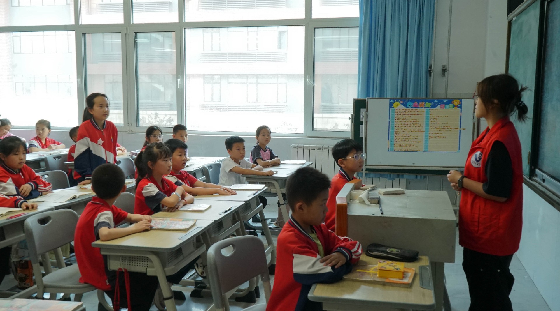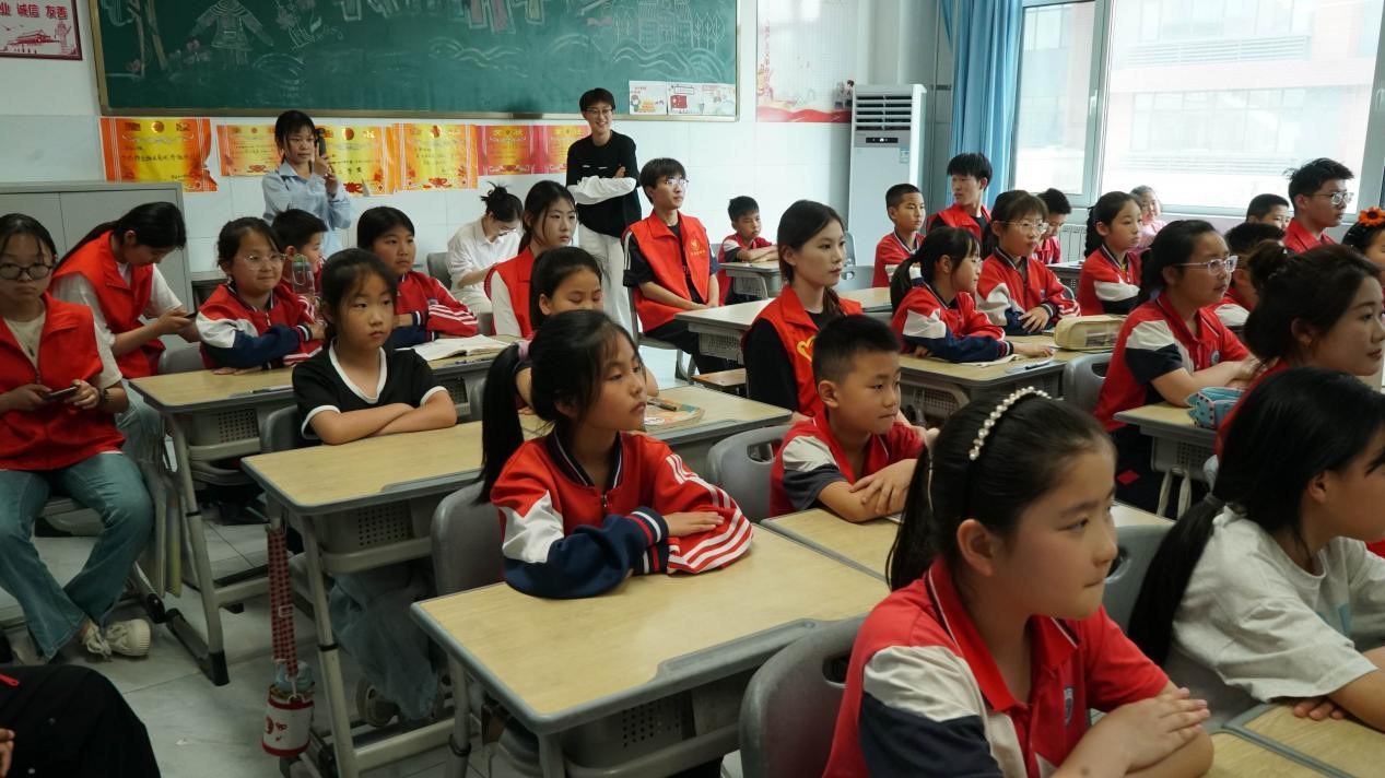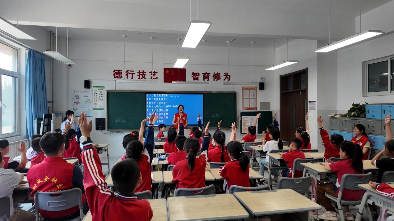 活动伊始,学生志愿者以声情并茂的讲述,如磁石般牢牢吸引住全场目光,为孩子们徐徐展开沂蒙精神的壮丽画卷,让这一伟大精神的独特魅力在童心中激荡起层层涟漪。随后,学生志愿者以饱满的热忱回溯沂蒙地区的峥嵘岁月,将经典故事娓娓道来。每一个故事都似一枚火种,点燃了孩子们心中的崇敬之火。讲解尾声,志愿者们以 “党群同心、军民情深、水乳交融、生死与共” 十六字凝练沂蒙精神的核心要义。继而抛出启发性问题,引发孩子们深度思考。现场气氛热烈非凡,一双双高举的小手,一张张专注的脸庞,孩子们用质朴却真挚的话语,诠释着他们对沂蒙精神的独特理解,字里行间,满溢着对先辈的无限崇敬,对红色精神的坚定传承之志。