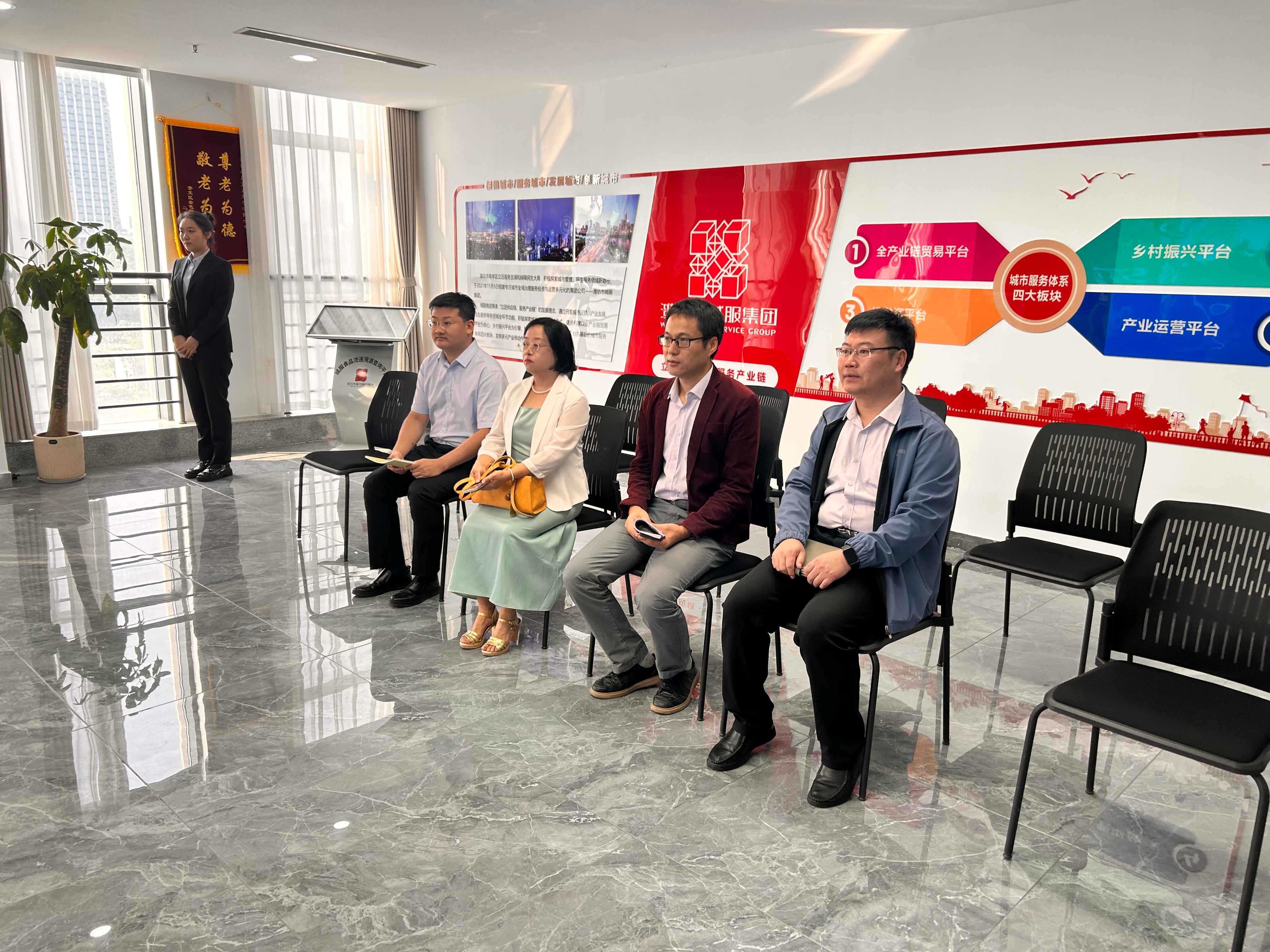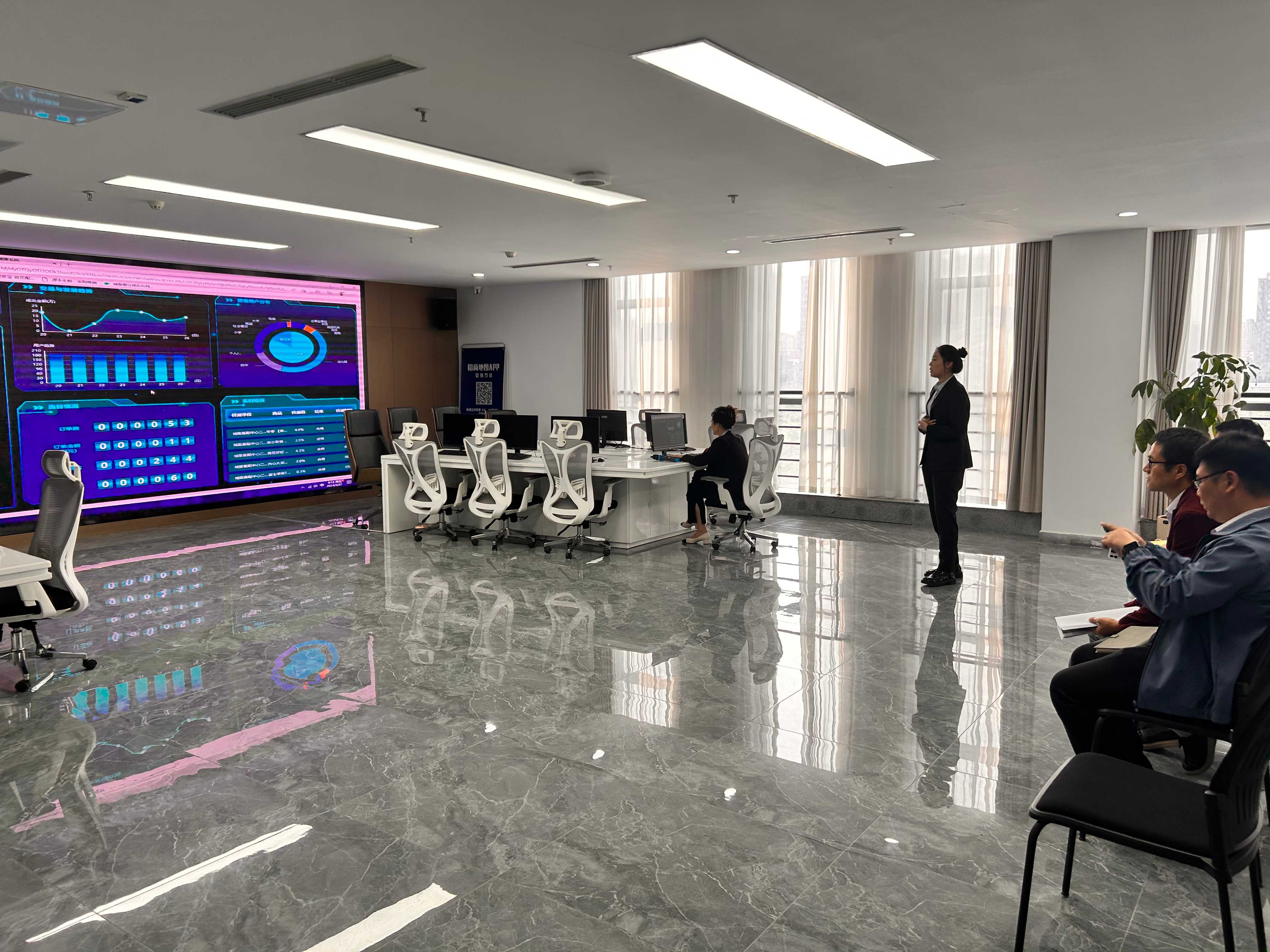 在滨城基金大厦,调研组首先参观了城市服务集团指挥中心,亲身体验智慧城市建设的前沿成果。细致聆听城市服务体系建设与运营的全面介绍,观看潍生活APP、数字化集采集配系统的现场演示,考察城市服务便利店与食安溯源系统的实时运行情况,进一步感受到科技赋能城市生活的巨大潜力。