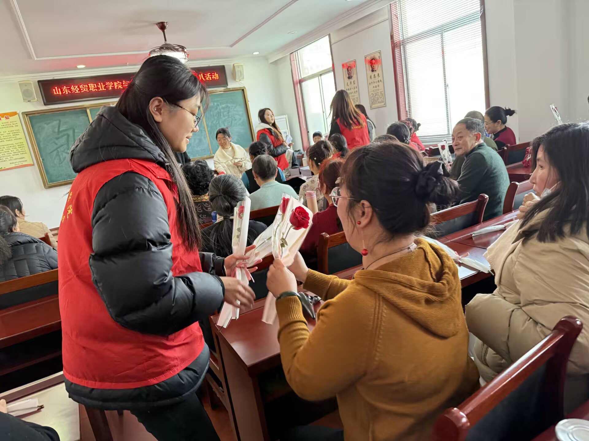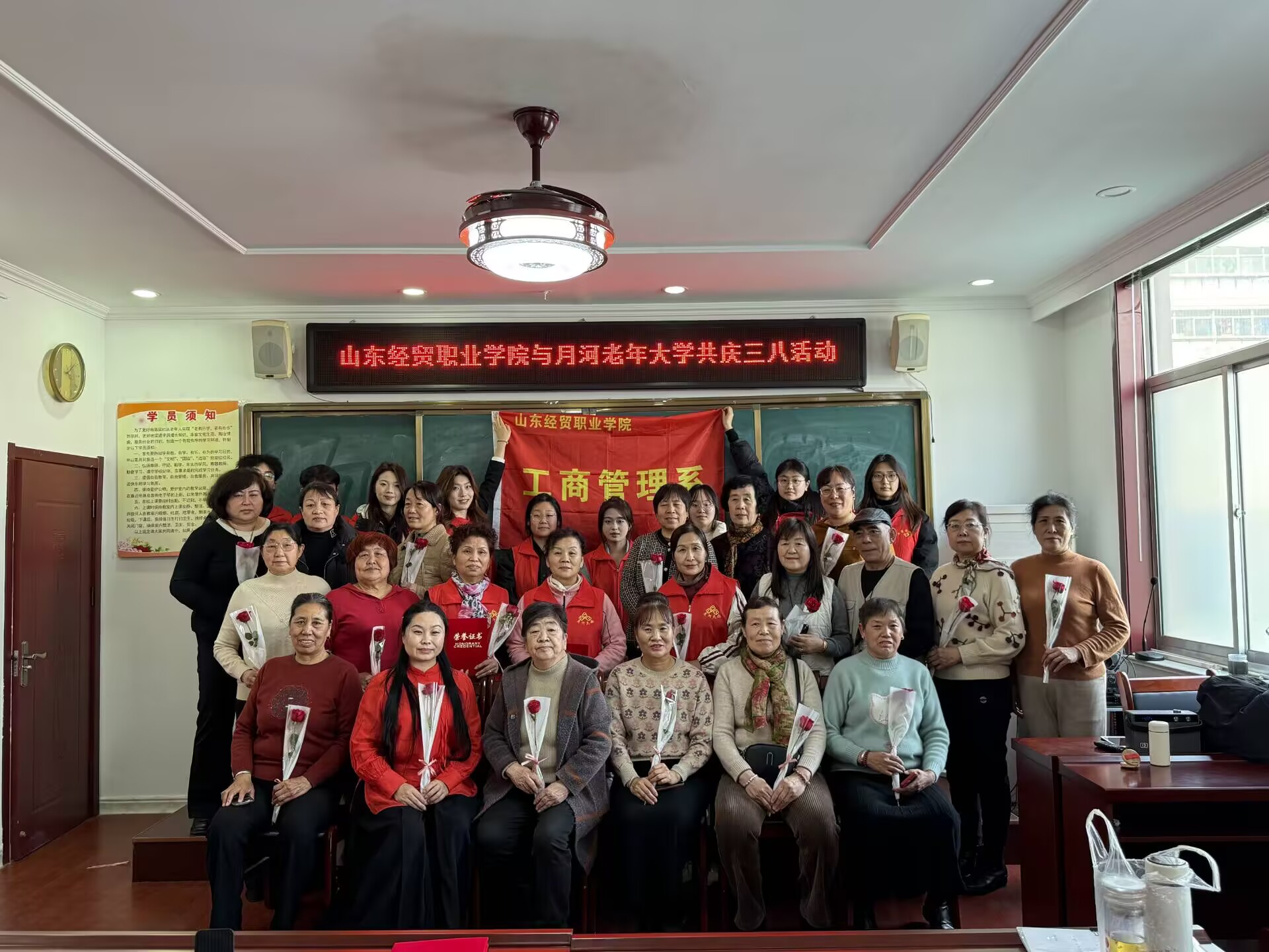 阳春三月,春风送暖,在“三八”国际妇女节这个特殊的日子里,山东经贸职业篮彩购买app工商管理系“足迹”志愿者协会与潍城区月河老年大学携手,共同举办了一场温馨而富有意义的庆祝活动。这场活动不仅增进了两代人之间的交流,更传递了红色精神,凝聚了社区力量。