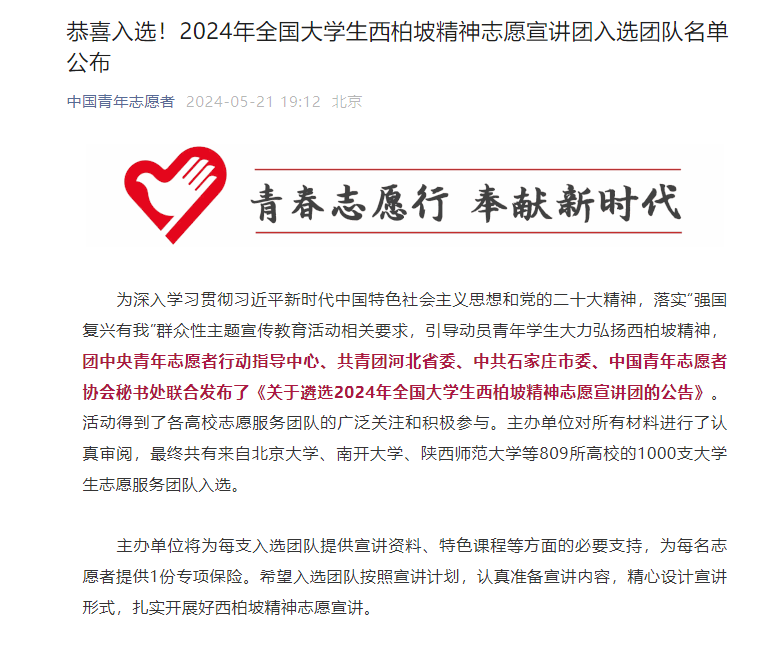 近日,共青团中央公布了本次宣讲活动入选团队名单,主办单位对所有材料进行了认真审阅,最终共有来自北京大学、南开大学、陕西师范大学等809所高校的1000支大学生志愿服务团队入选,工商管理系“星火”志愿服务队成功入选2024年全国大学生西柏坡精神志愿宣讲团。