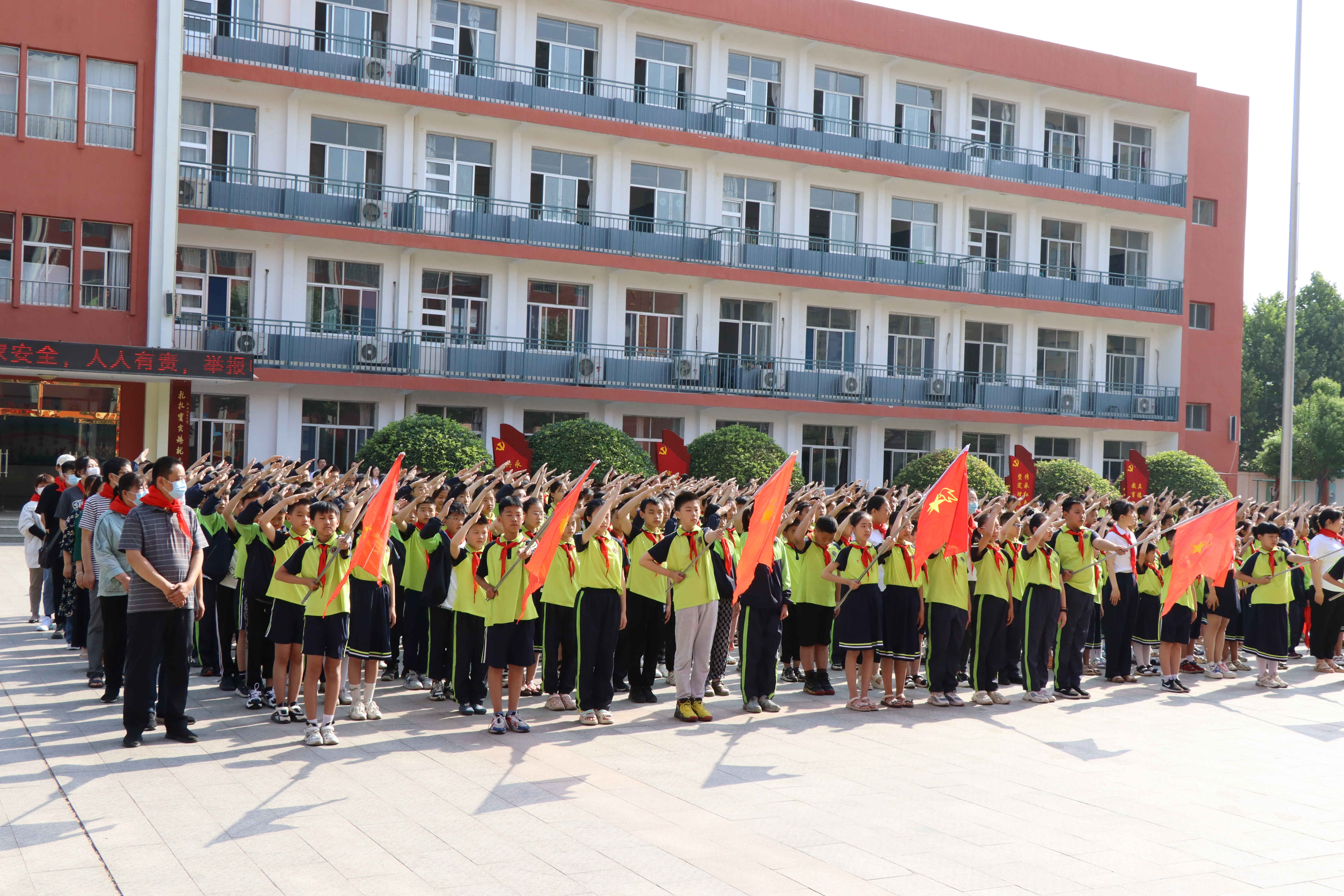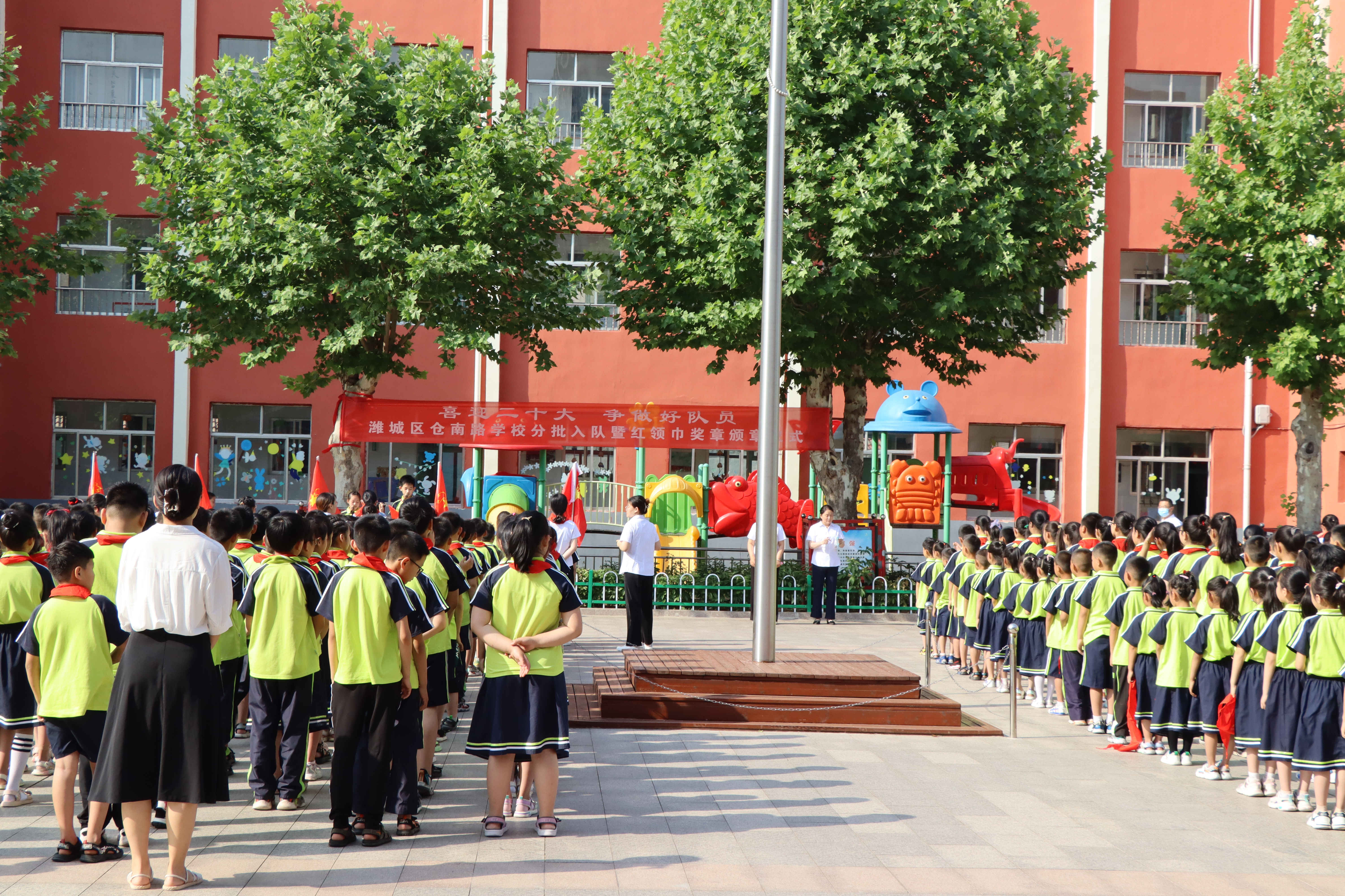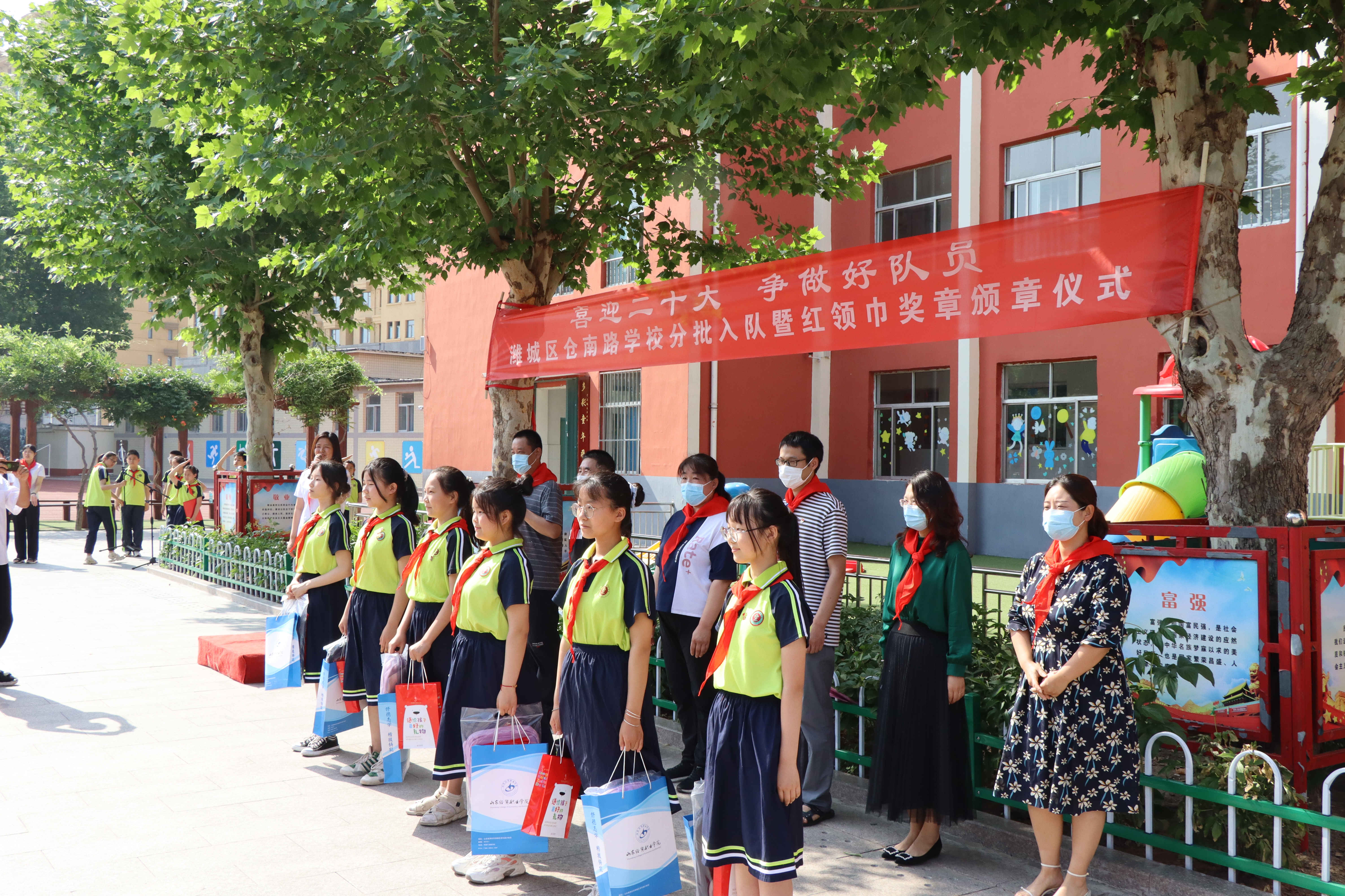 2022年6月1日上午,工商管理系党总支部分党员及入党积极分子代表,参加了潍城区仓南路学校“喜迎二十大 争做好队员”分批入队暨红领巾奖章颁章仪式。全体成员参与了孩子们的入队、唱队歌、颁奖章等仪式。