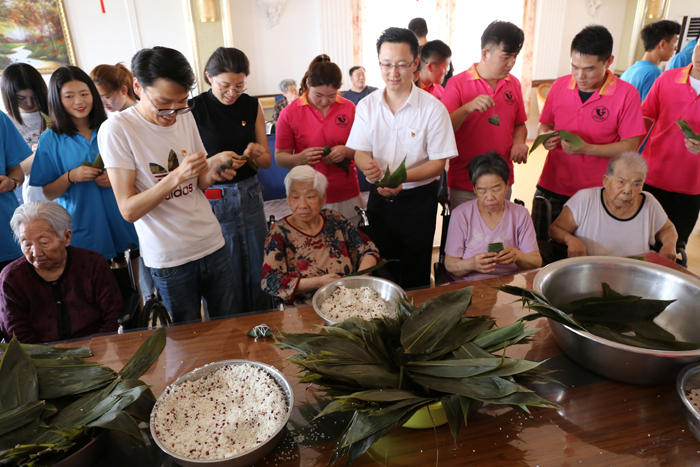 荣康老年疗养中心辛云霞主任向志愿者们详细介绍了养老中心的基本情况及近年来党和政府对养老中心的资助政策。接着,志愿者们将提前准备好的糯米、红枣、粽叶、红豆等材料整齐地摆放在桌子上,大家围在一起,纷纷露出看家本领,捋粽叶、做漏斗状,填糯米、压紧实,封口、扎捆,巧手翻飞,不一会儿功夫,三角形、牛角形、长条形等一只只各式各样的漂亮粽子成型,两个小时内共包好了300多个粽子。 在包粽子过程中,老人和志愿者们互相交流,互相学习,大家看着自己亲手包好的粽子很是欣喜。包粽子结束后,食堂工作人员帮大家把包好的粽子现场煮熟。不一会儿,热气腾腾的粽子上桌了,大家品尝着自己亲手包的粽子,气氛欢乐祥和。