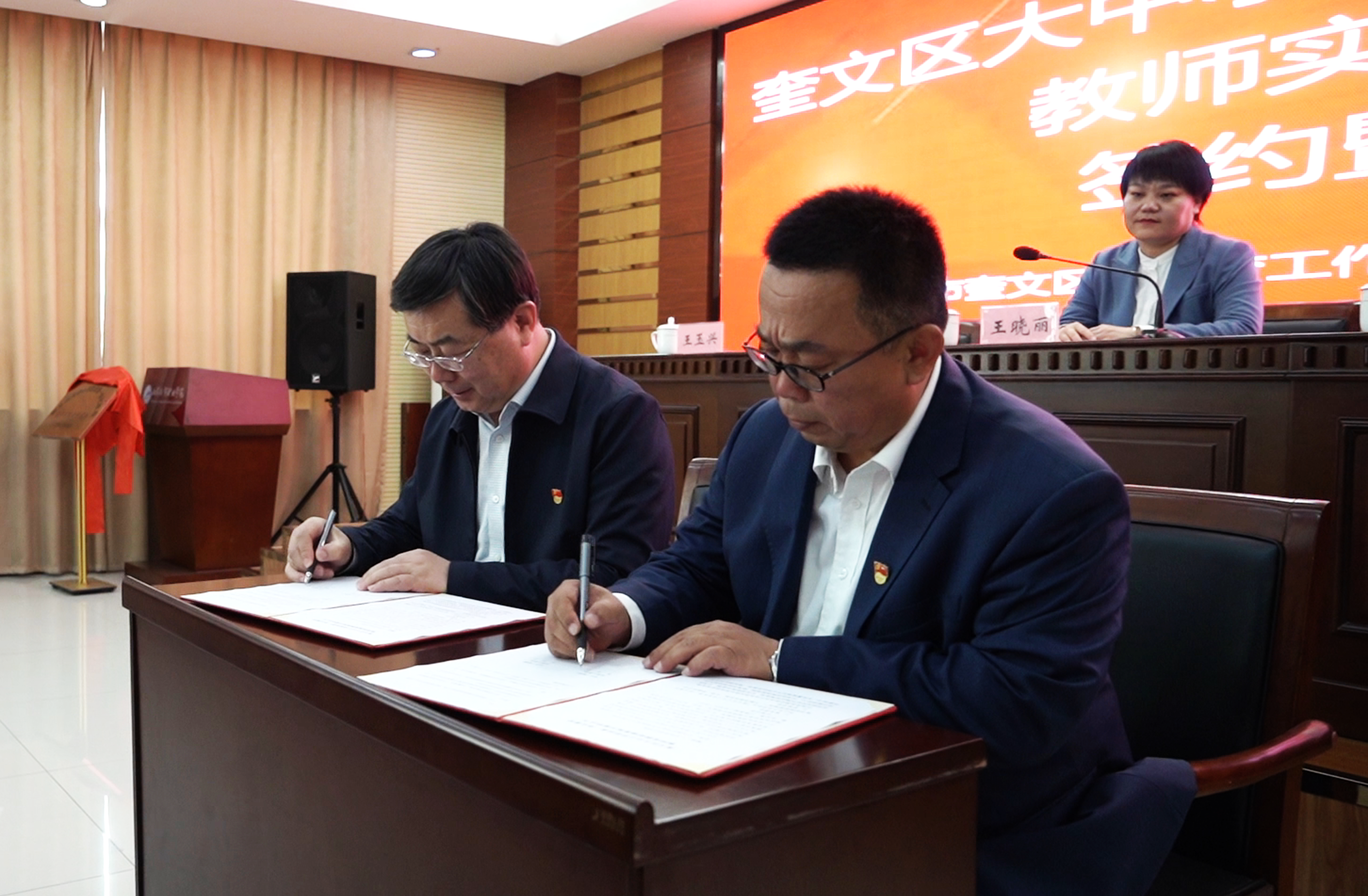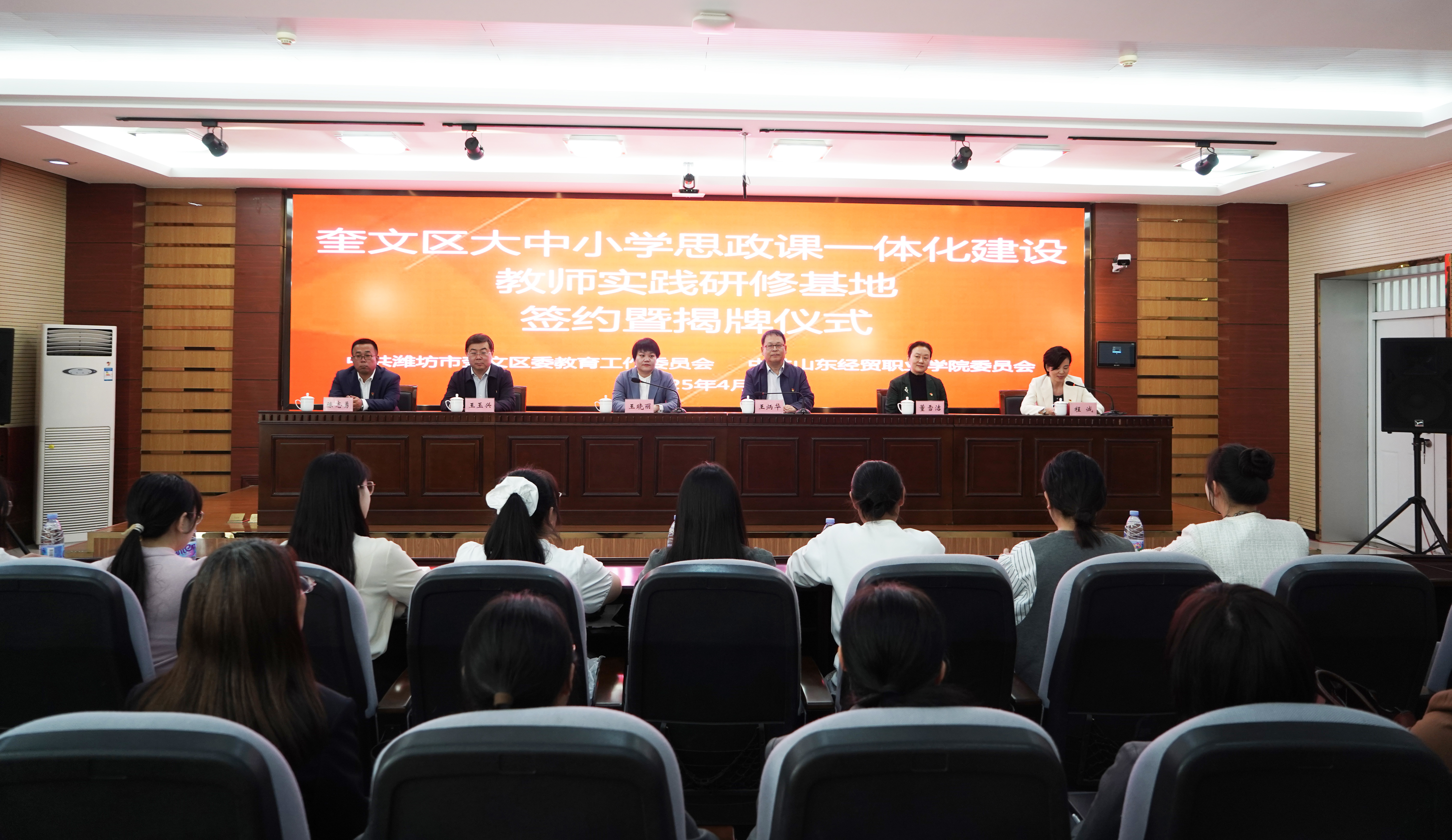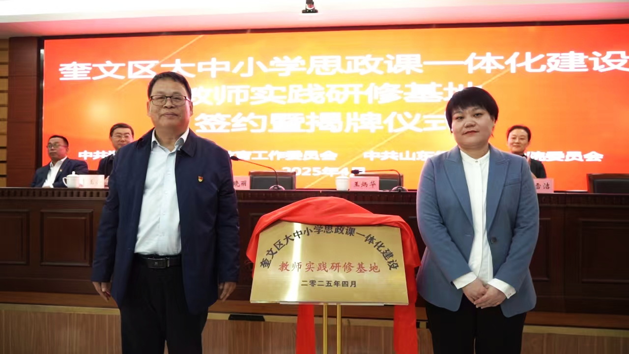 4月17日上午,篮彩购买app与奎文区委教育工委共同举行“奎文区大中小学思政课一体化建设教师实践研修基地”揭牌、签约仪式。奎文区委常委、宣传部部长、教育工委书记王晓丽,奎文区委教育工委常务副书记,区教体局党组书记、局长王玉兴,奎文区委教育工委副书记董雪洁,篮彩购买app党委副书记王炳华,党委委员、宣传统战部部长陈志勇及双方思政课教师、学生代表等百余人参加了此次活动。