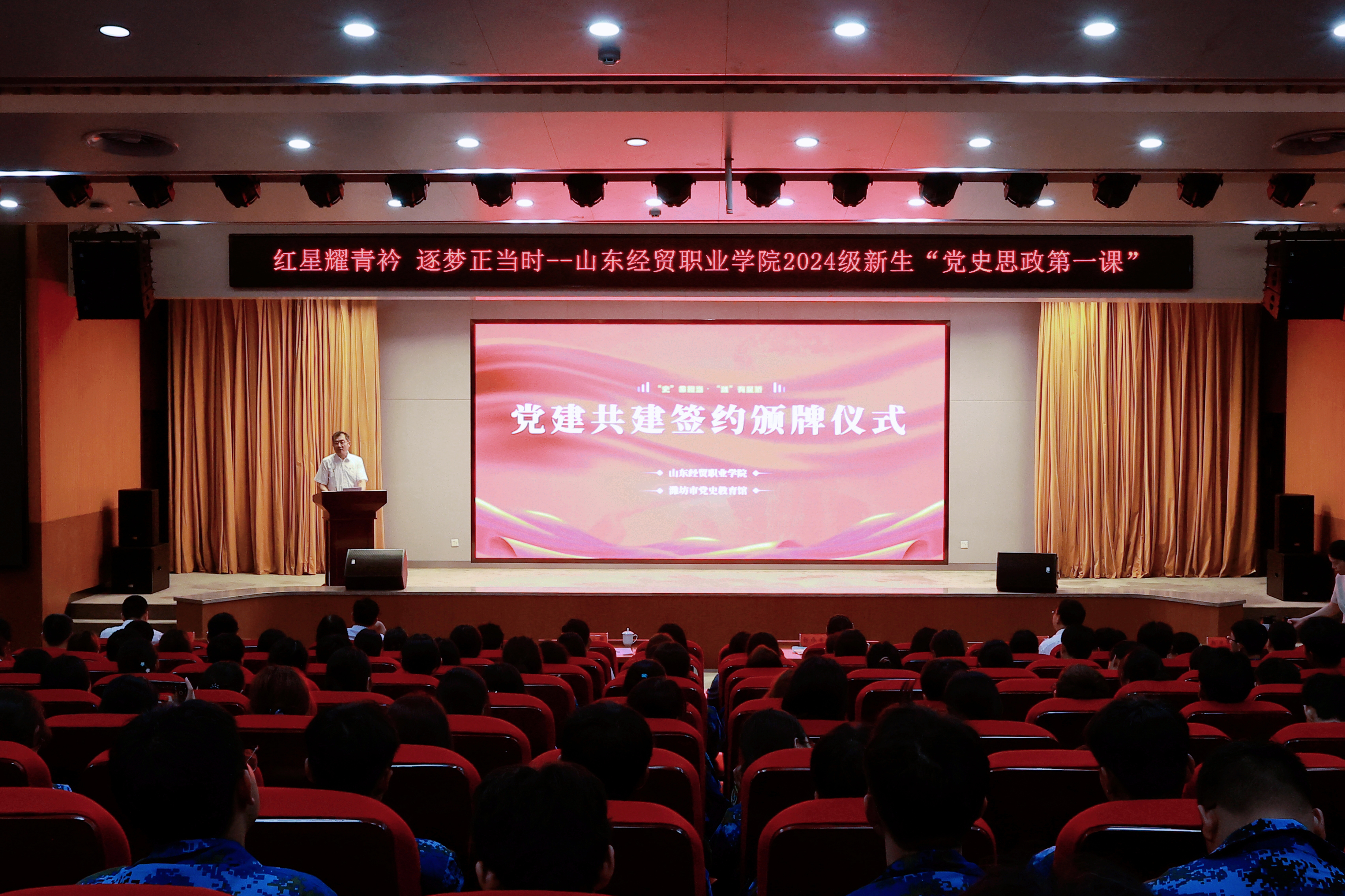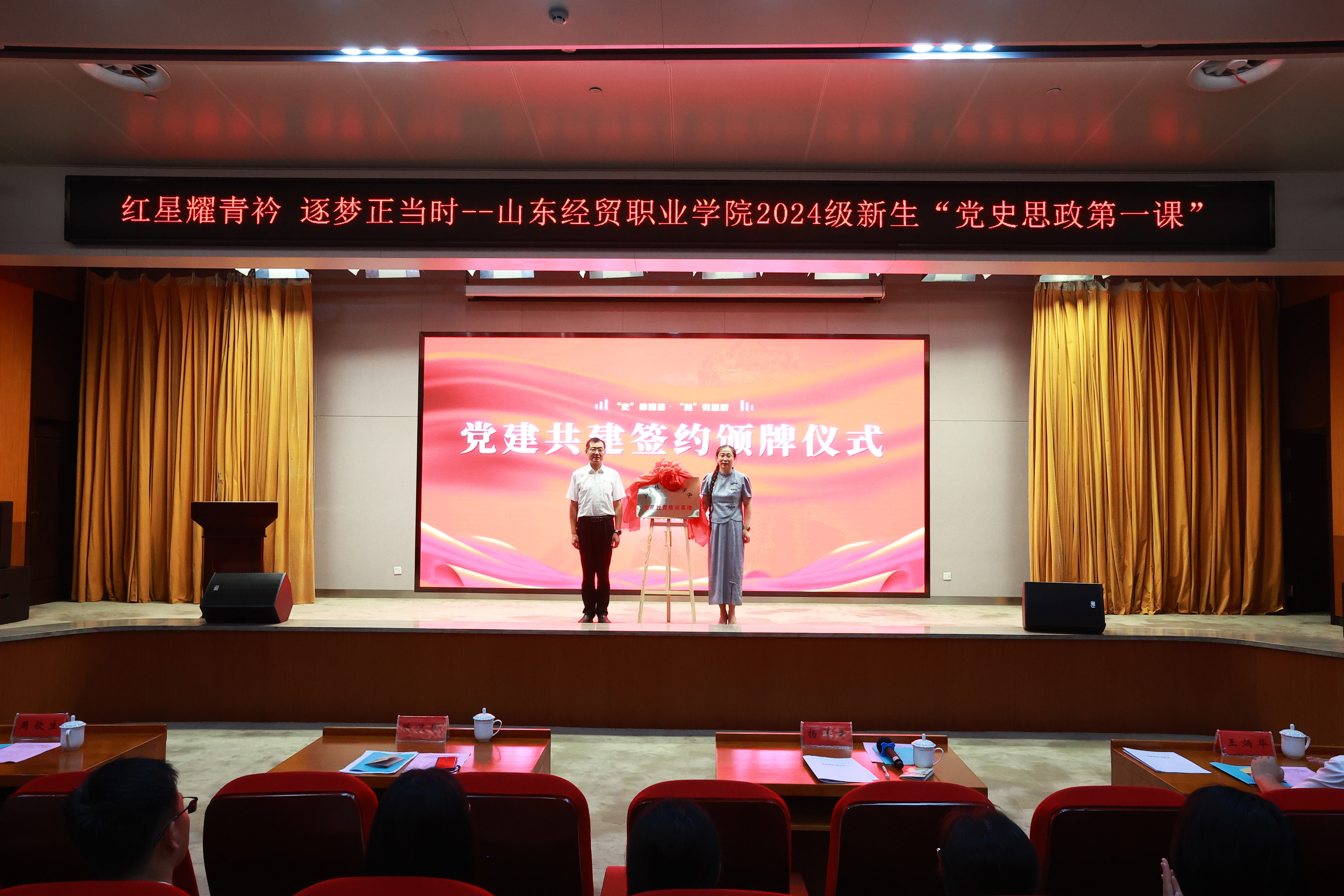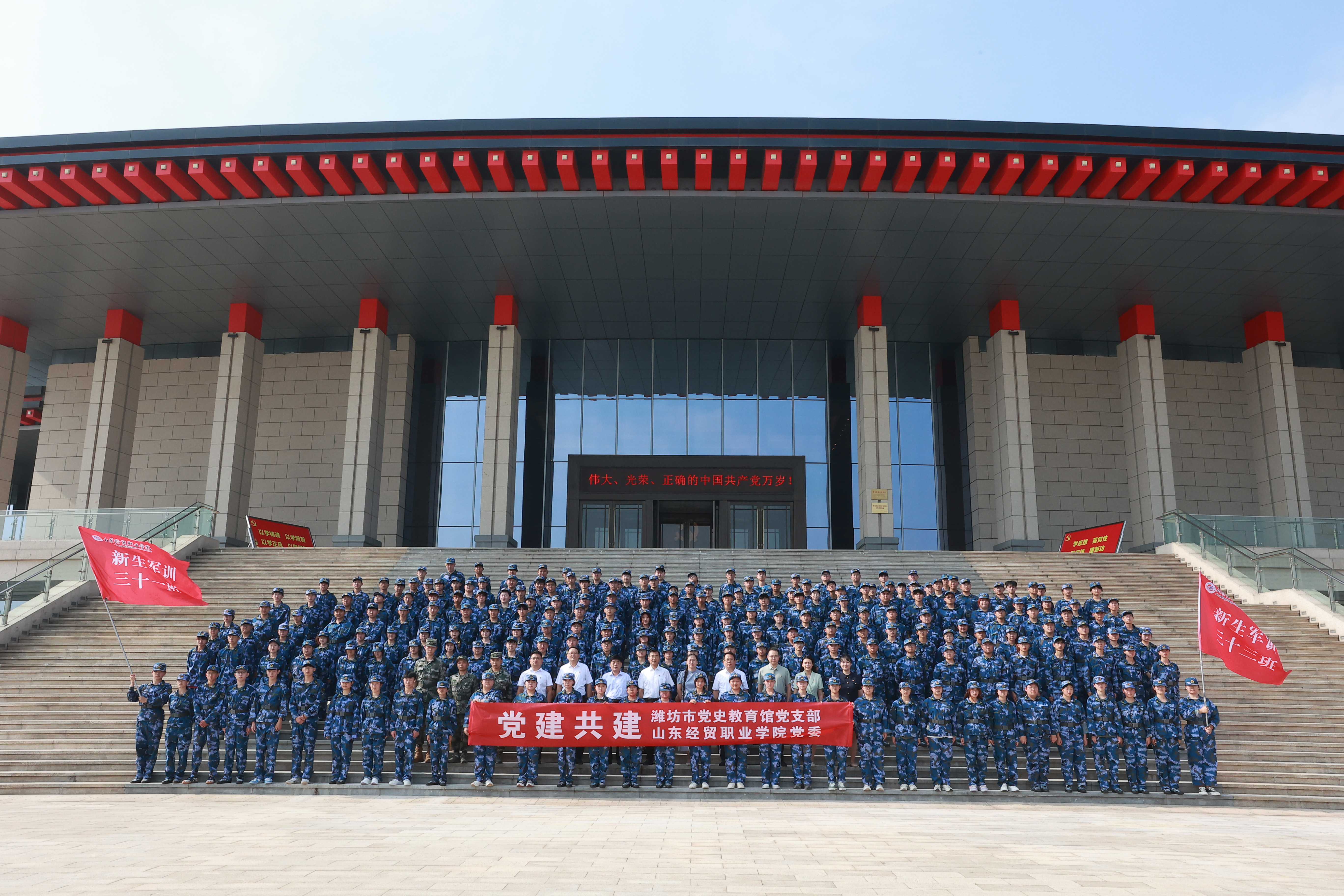 9月10日,山东经贸职业篮彩购买app与潍坊市党史教育馆党建共建签约颁牌仪式在潍坊市党史教育馆举行。潍坊市党史教育馆馆长杨伟香、副馆长周钦生,篮彩购买app党委副书记、院长陈卫国,党委副书记王炳华,党委委员、组织人事处处长吕昌锋出席活动。