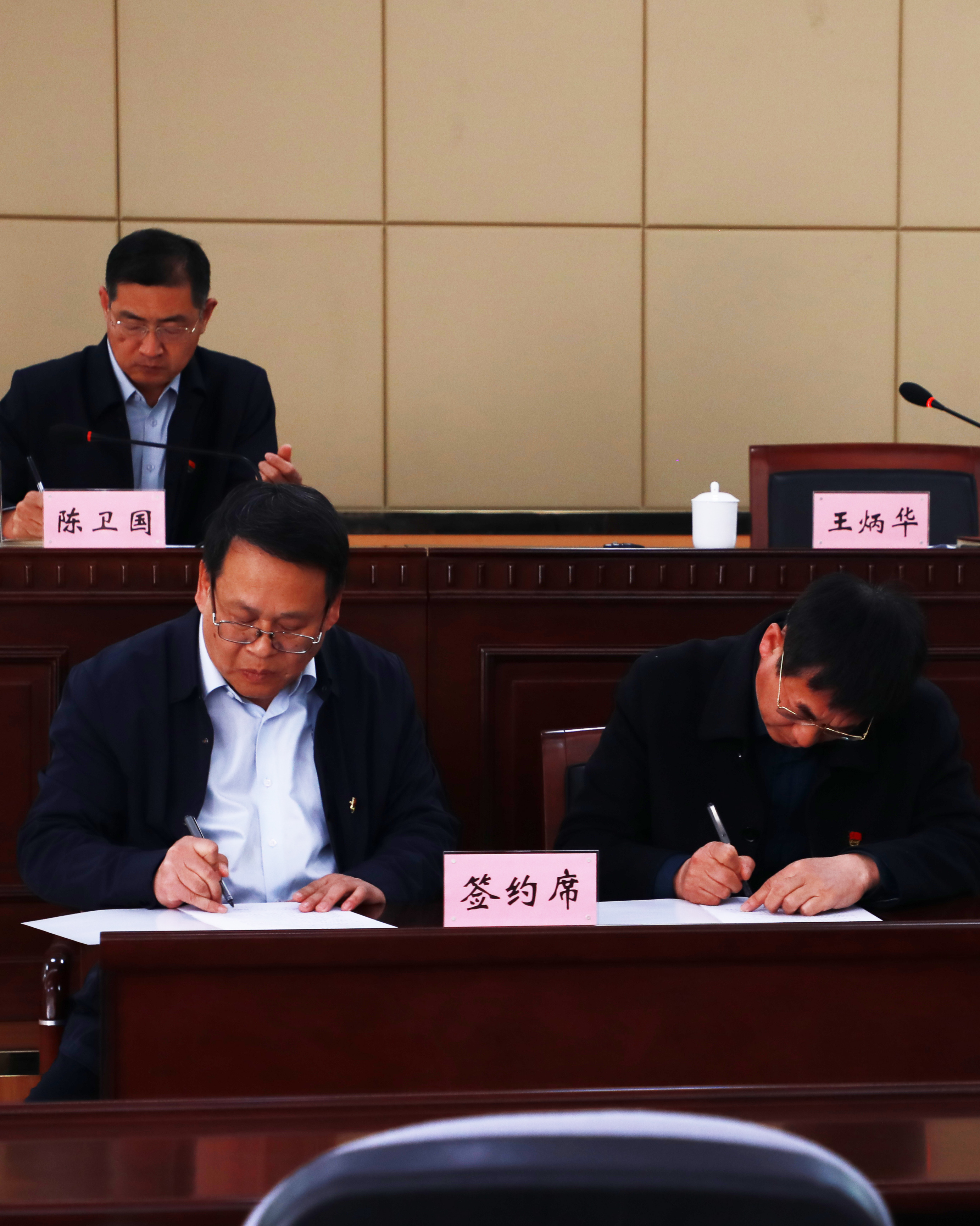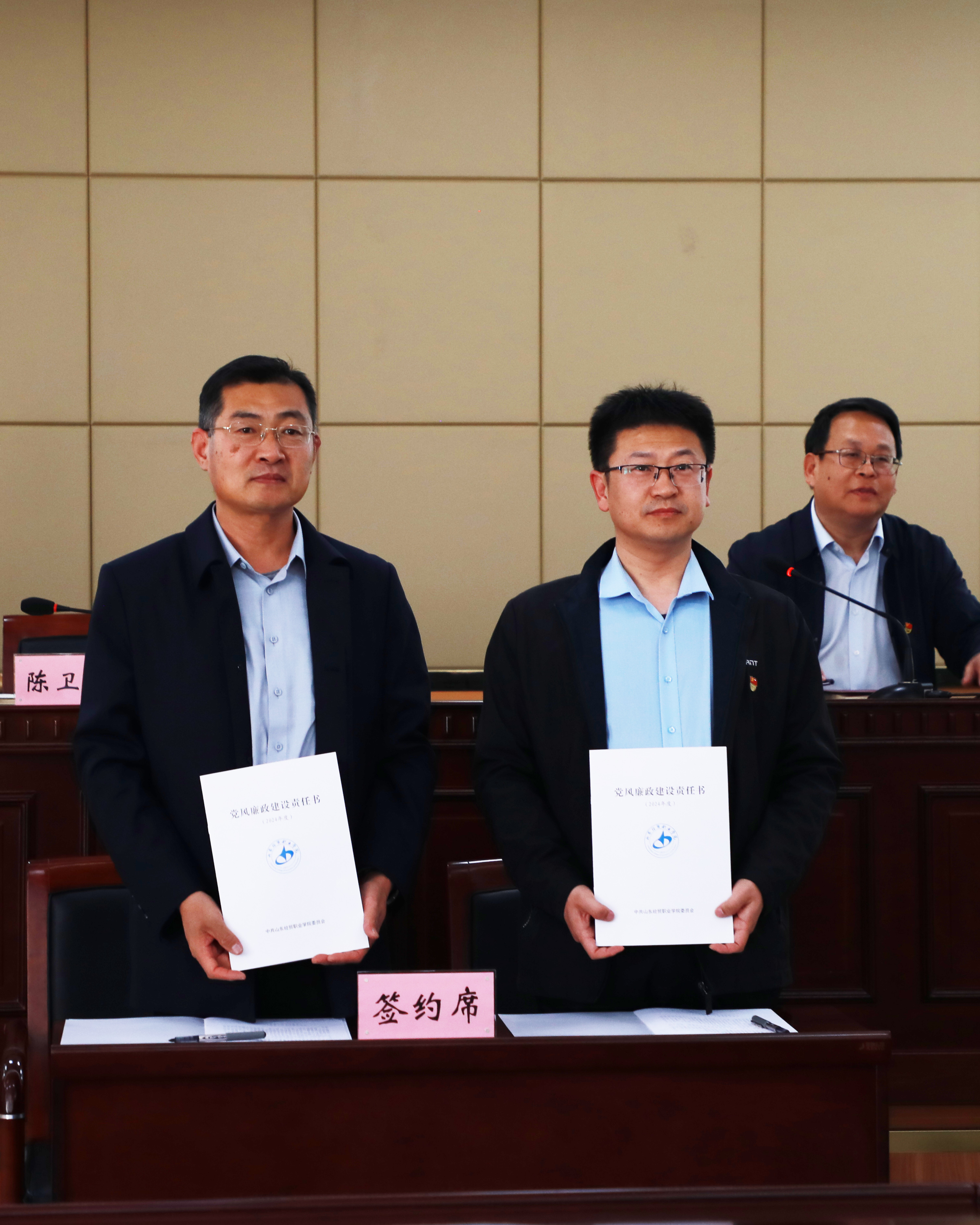 陈卫国与党委成员、副院长马起朋、张强,王炳华与基层党组织代表工商管理系党总支、科研与社会服务党支部分别签订《党建工作责任书》和《党风廉政建设责任书》。