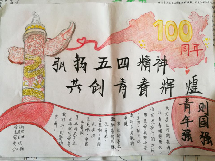 为纪念五四运动100周年,弘扬五四精神,思政课教师通过线上线下组织“五四运动”知识问答、观看视频、“弘扬五四精神,创造青春辉煌”主题手抄报等活动,让“五四”精神进课堂、进学生头脑。