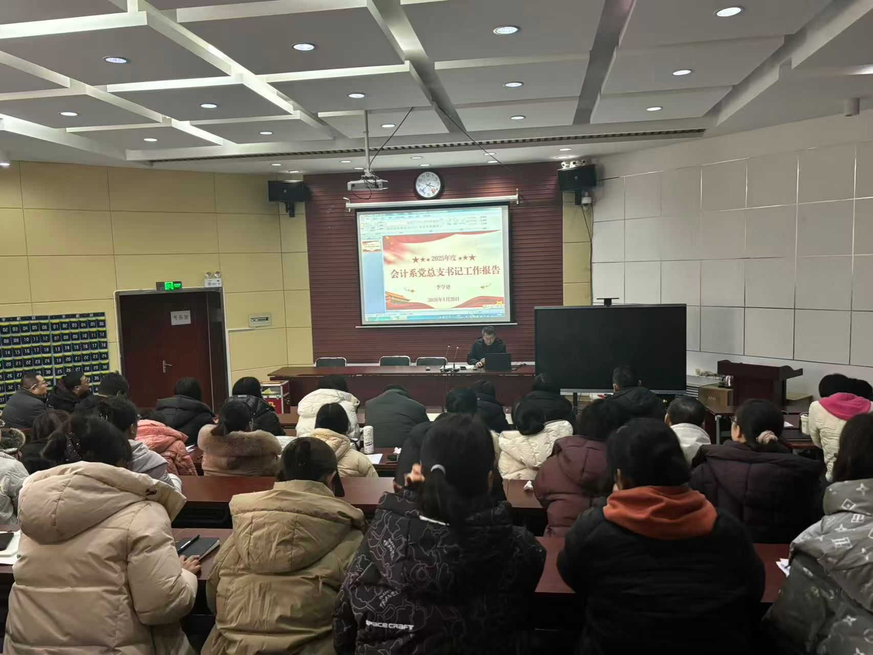 2026年1月26日下午,在会计系1#教学楼122会议室,系党总支书记李学建向全体党员作2025年度基层党建工作报告。报告回顾了党总支在强化思想政治建设、落实党建重点任务、加强党员队伍建设、落实党建工作责任等方面的工作举措与成效,分析了在党建工作创新、党建与业务深度融合、党员教育管理服务等党建工作存在的短板,提出了2026年党建工作下步打算。