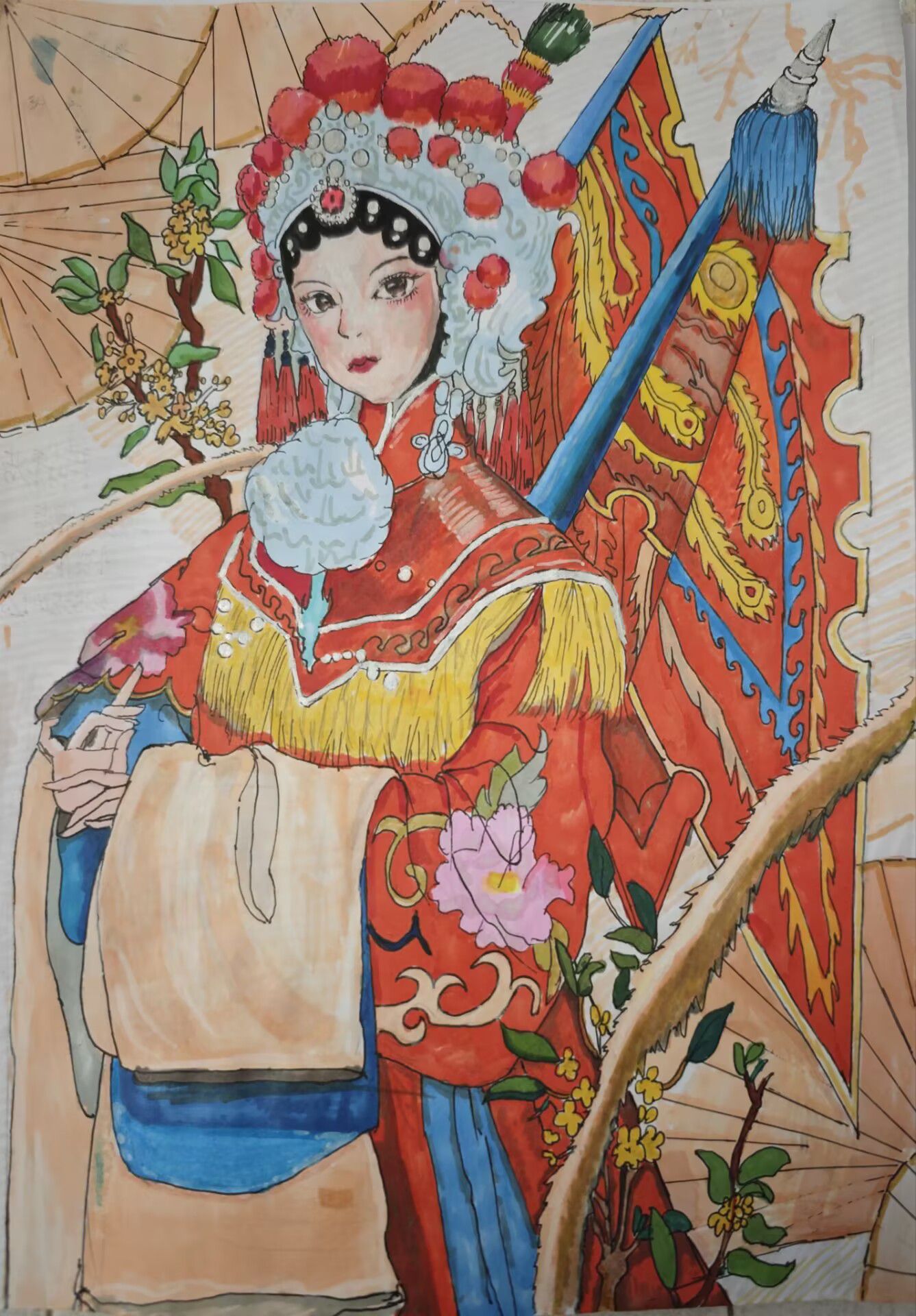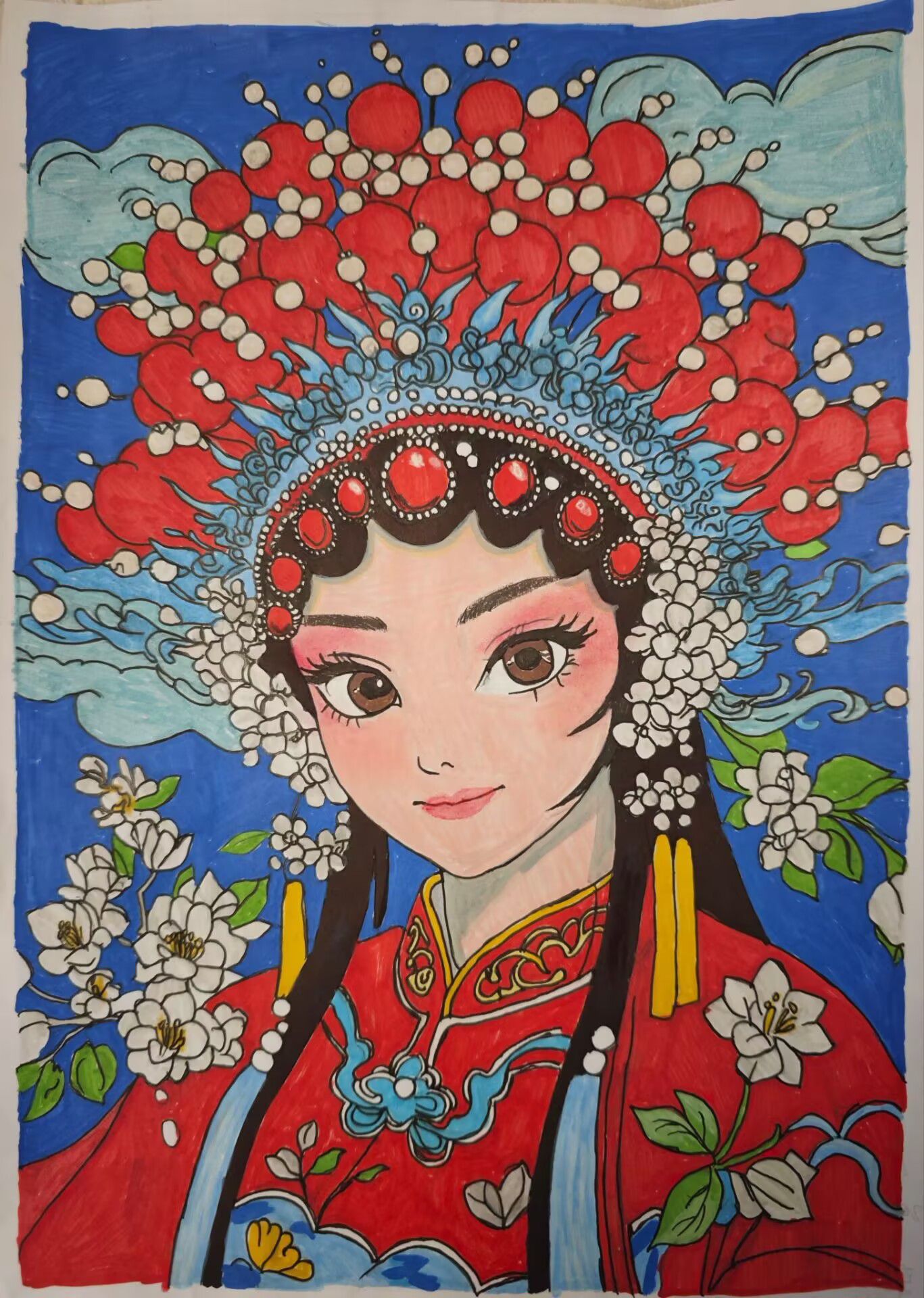 本次活动中,参赛者们通过手绘、彩绘等多种形式,创作出一幅幅具有京剧元素的绘画作品。2024级大数据与会计2班时梦晗同学的作品以京剧“生旦净丑”行当为核心,对应孙悟空(武生)、穆桂英(刀马旦)、关羽(武净)、蔡庆(武丑),角色形象鲜明,服饰配色浓烈且贴合行当特征,既展现戏曲行当特点,又通过生动造型传递了传统艺术韵味。2024级大数据与会计3班曹梦欣同学的作品以京剧旦角为核心,头饰华丽饱满(红底配珠饰、蓝纹),服饰红金配色显戏曲韵味,背景蓝底衬云纹、白花,既还原戏曲妆造细节,又以卡通化眉眼柔化风格,色彩对比浓烈却和谐,传统元素与现代画风融合得鲜活灵动。2024级大数据与会计7班陈佳旭同学的作品以黑白线描为主,融入局部红色点缀,构图以戏曲旦角面容为核心,头饰与花卉纹样交织,线条细密且层次丰富,黑红撞色强化视觉张力。既保留传统戏曲元素的精致感,又以装饰性线条营造出神秘朦胧的氛围,风格独特且细节饱满。