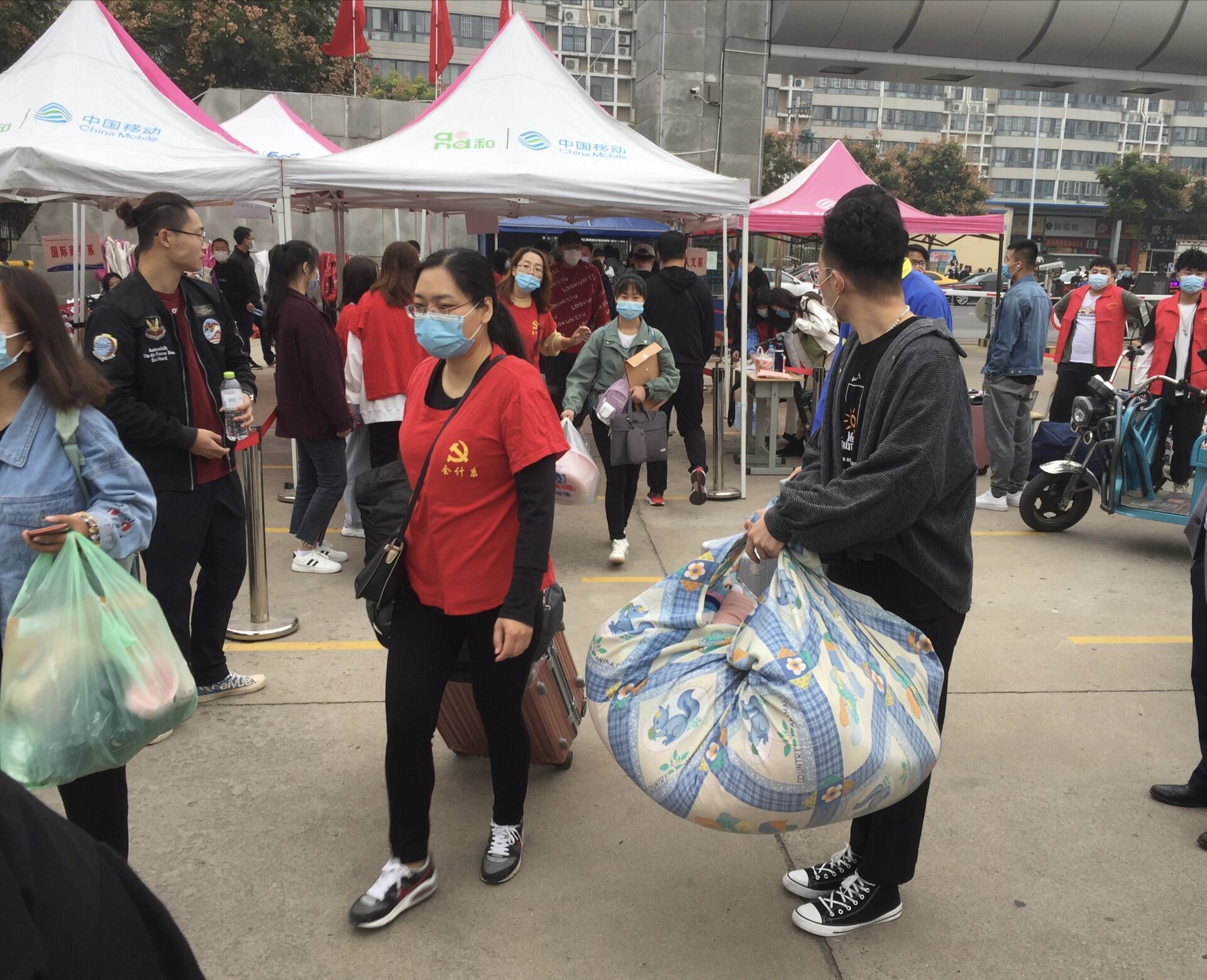 校门口,老师们从家长手中接过沉甸甸的行李,一趟趟装车、运送。从北大门到会计系报到处,再到宿舍楼,校园里处处涌动着师生志愿者忙碌的身影,拉皮箱、搬被褥、帮新生整理床铺,志愿服务不仅为独立报到的新生提供了最大的便利,也拉进了新生与老生的距离。