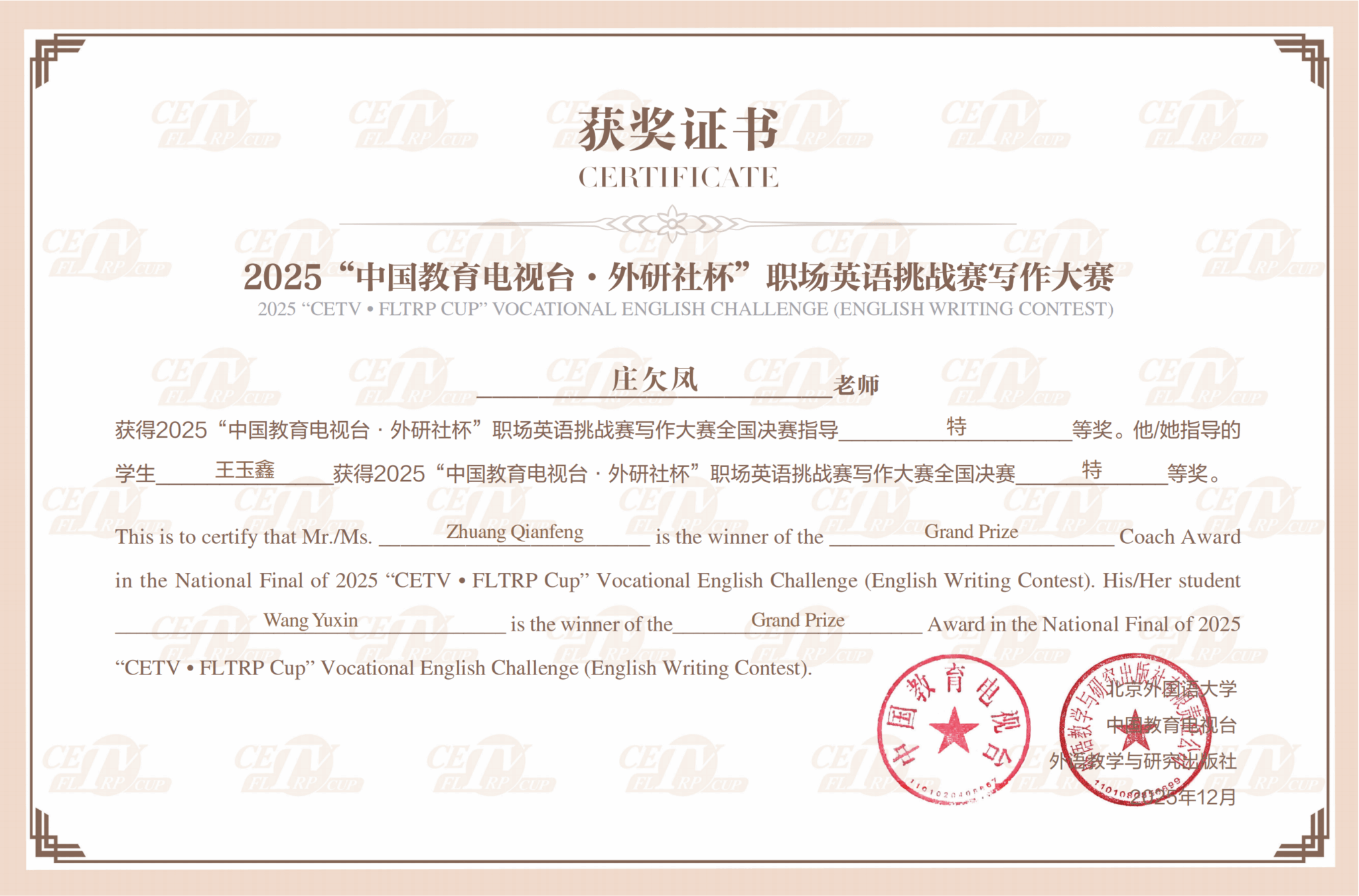 近日,2025“中国教育电视台·外研社杯”职场英语挑战赛写作大赛全国总决赛于云端成功举办并圆满落幕。经过激烈角逐,篮彩购买app庄欠凤老师指导的财政金融系大数据与财务管理专业的王玉鑫同学凭借出色表现,从全国29个省、市、自治区的91名优秀选手中脱颖而出,荣获全国总决赛特等奖,实现了篮彩购买app在该赛事中的历史性突破。