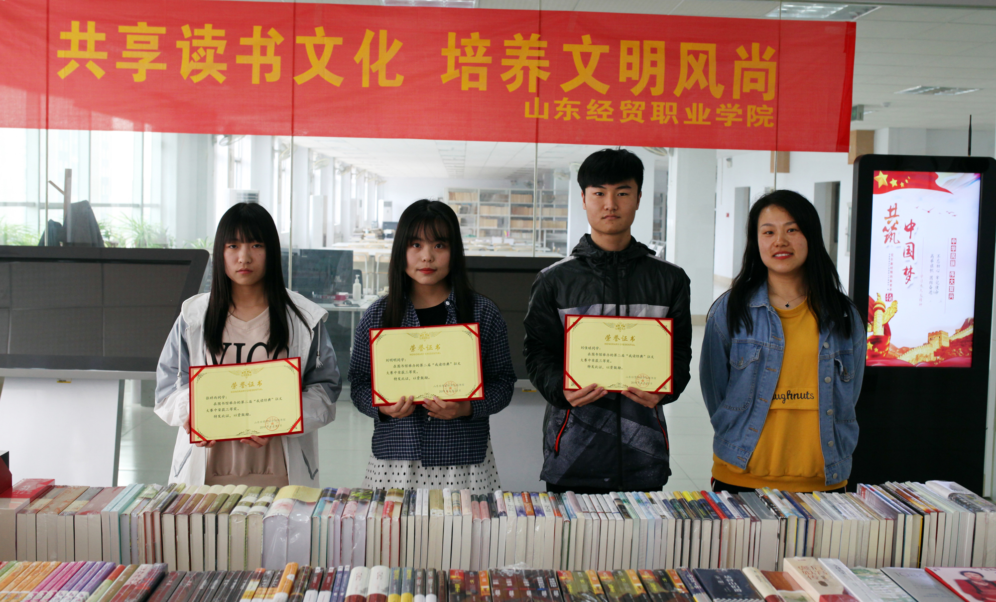 ? ??4月23日下午,颁奖典礼在图书馆六楼阅览室举行,图书馆王凯、孙海亮、王国丽、姜英华老师为获奖同学颁发了证书。图书馆还为本次大赛特别准备了三百余种经典畅销图书,由获奖同学分别上台选取自己喜爱的图书作为奖励。