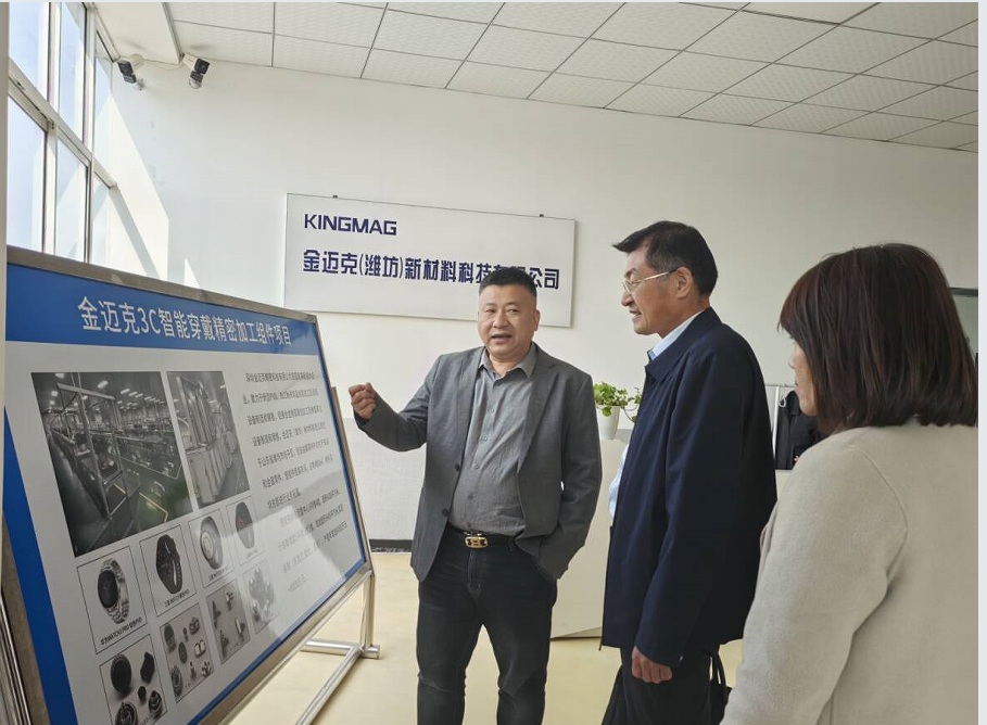 在金迈克(潍坊)新材料科技有限公司负责人赵红星的陪同下,参观了企业电子元器件的生产线,双方就人才需求、学生实习就业进行沟通交流。
