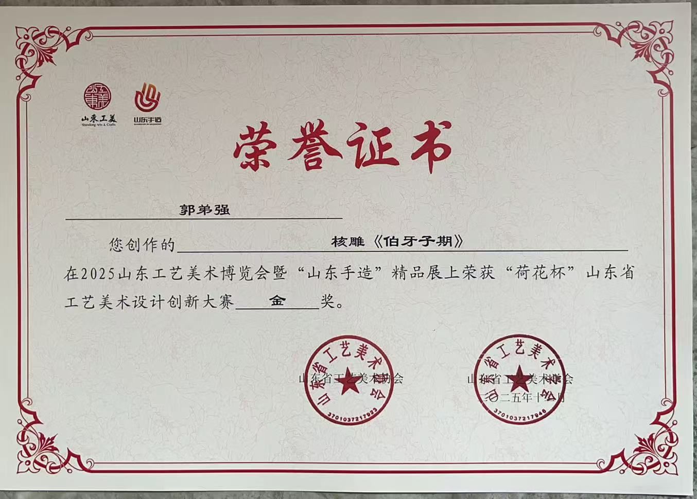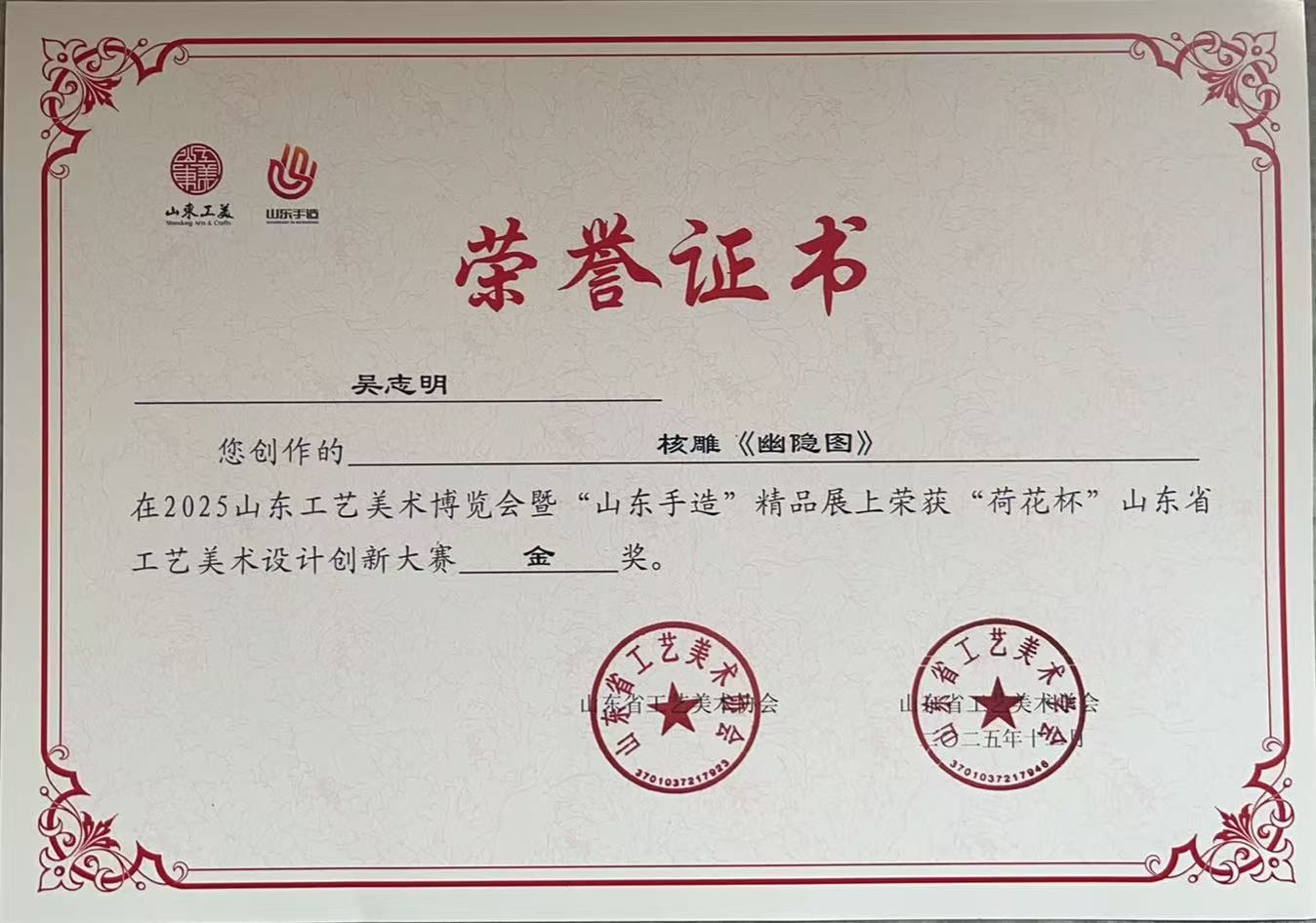 展会期间,工作室选送的核雕作品《核舟记》《伯牙子期》《幽隐图》凭借精巧的构思、细腻的工艺和深厚的文化内涵,成功斩获“荷花杯”山东省工艺美术设计创新大赛金奖;另一件核雕力作《福寿三多》以传统吉祥符号为创作核心,在技艺表达与创意呈现上独具匠心,荣获银奖。获奖作品既传承了核雕技艺的精湛传统,又在题材选择、表现形式上融入时代元素,充分诠释了“在继承中创新,在创新中发展”的创作理念,得到了专家评委与参展观众的高度认可。工作室的参展作品凭借鲜明的风格、深厚的文化内涵与精湛的工艺,吸引了众多观展者与业内专家的驻足关注。不少观众表示,工作室的作品既保留了传统工艺的“老味道”,又透着新时代的“新创意”,让人看到了传统手工艺与现代生活融合的无限可能。此次参展不仅是对工作室技艺水平与创新能力的一次全面检验,更是一次重要的行业交流契机,为工作室后续深化技艺研究、拓展合作空间奠定了坚实基础。